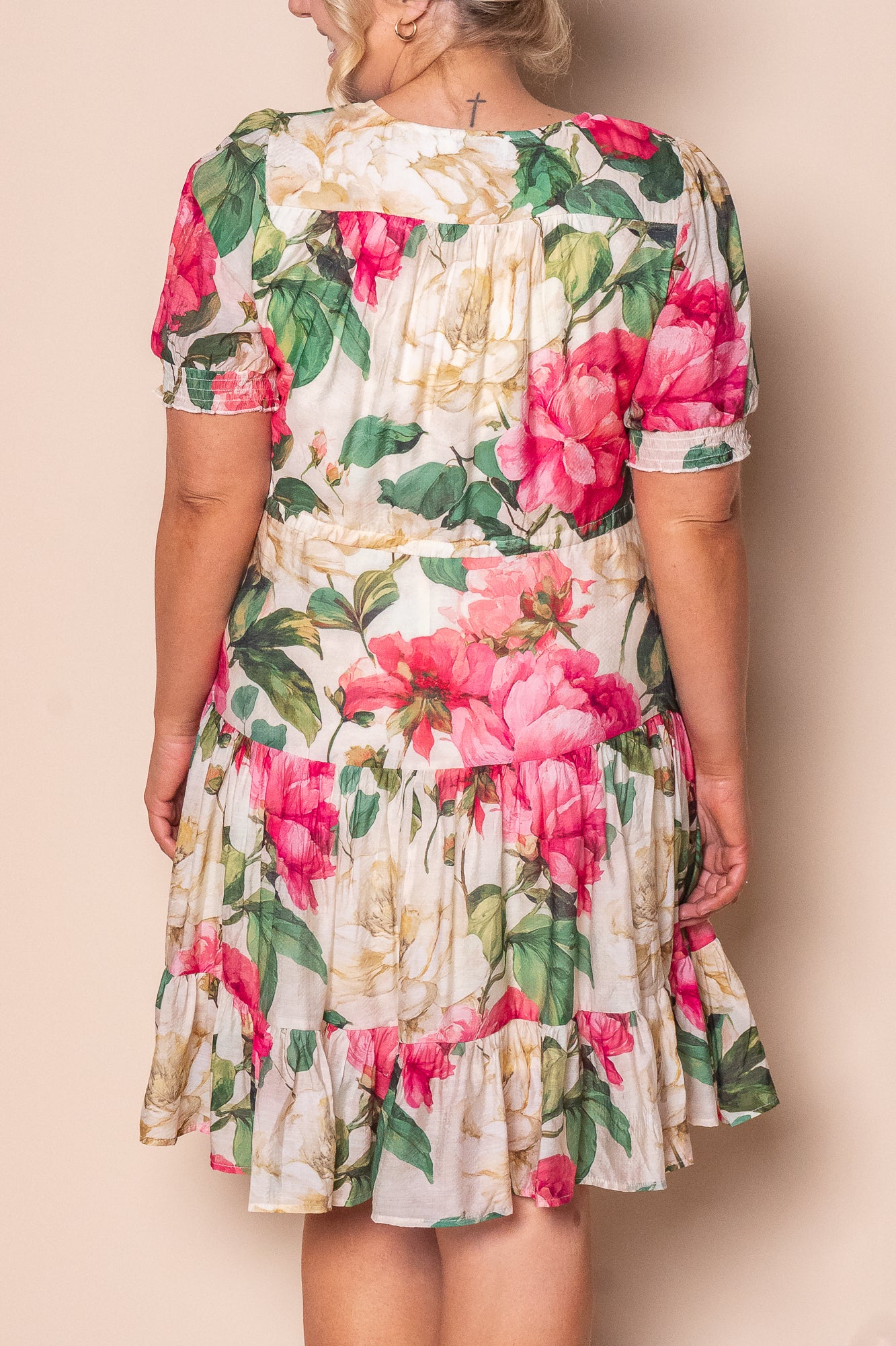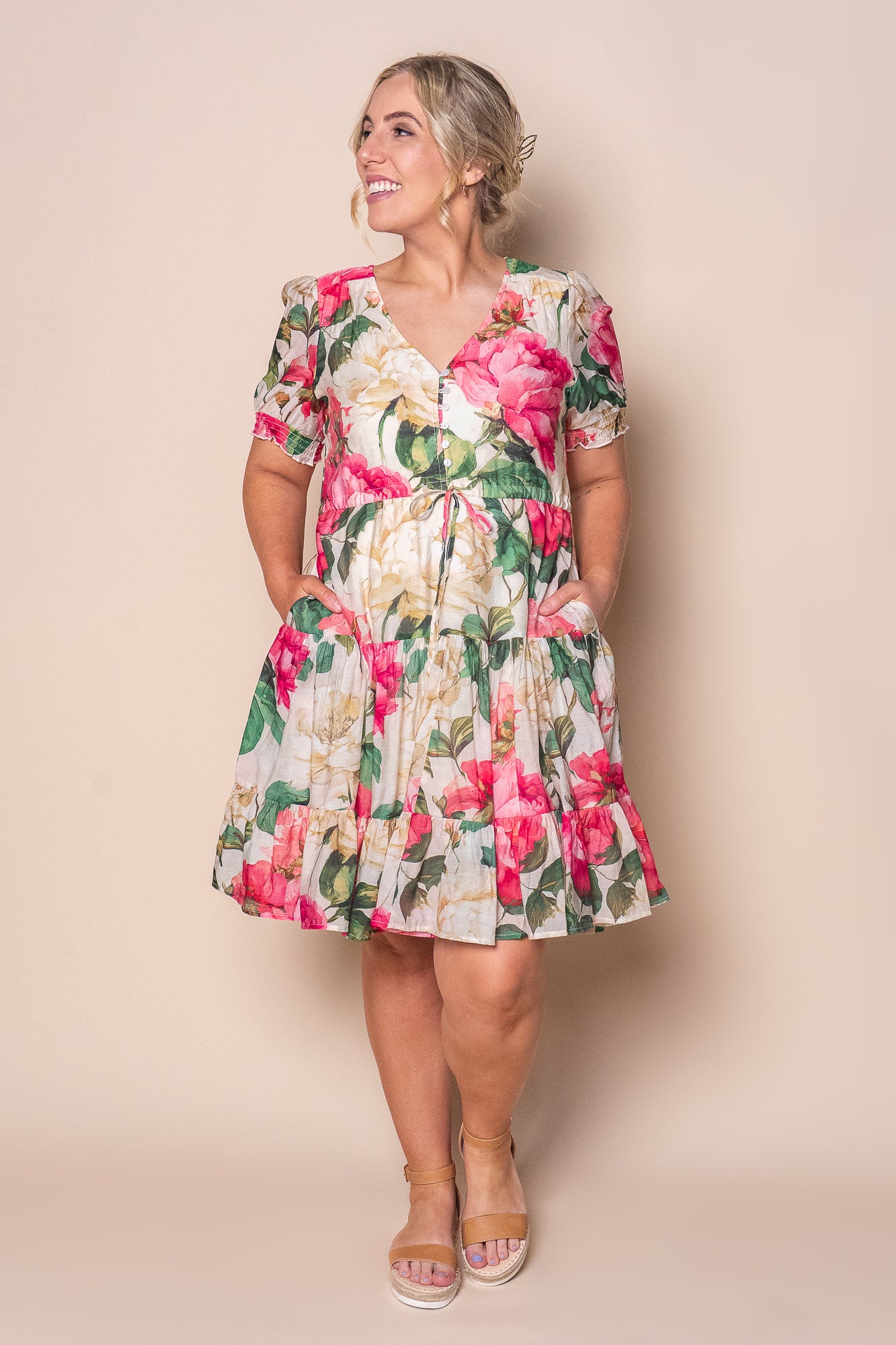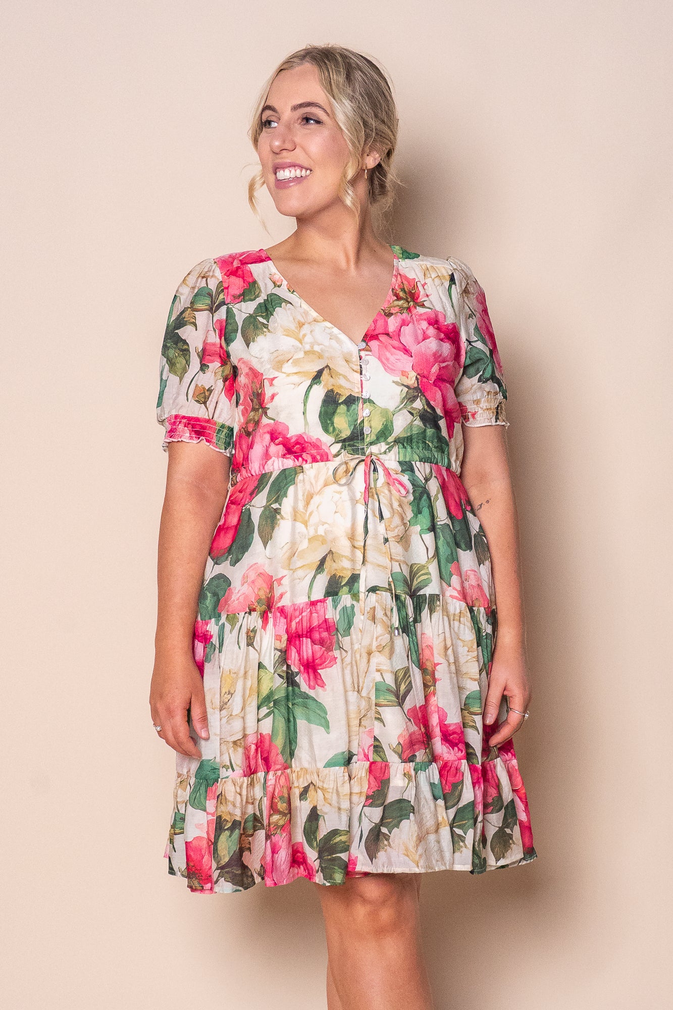 Effortlessly charming, this pink floral dress brings a splash of colour to your everyday wardrobe. The relaxed v-neckline and short elasticated sleeves create a breezy silhouette, while the drawstring waist lets you cinch it just right. Fully lined for comfort and confidence, it's the perfect piece for casual outings or weekend adventures. Dress it up or down—this versatile beauty does it all.