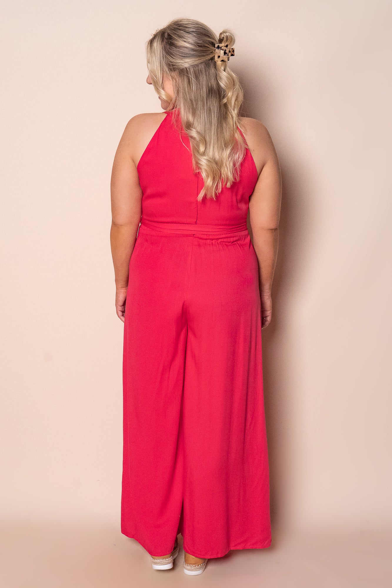Make a statement in this striking red jumpsuit, designed for effortless elegance. The front V neckline and sleeveless cut create a refined silhouette, while the wrap front with hook and eye closure adds versatile styling options. A fitted front waistband with detachable tie lets you adjust the look to suit your mood. The back features a round neckline with zipper and elasticated waistband for comfort and ease. Functional side pockets and wide, full-length pants complete this sophisticated piece. Crafted from 100% rayon for a luxurious drape.