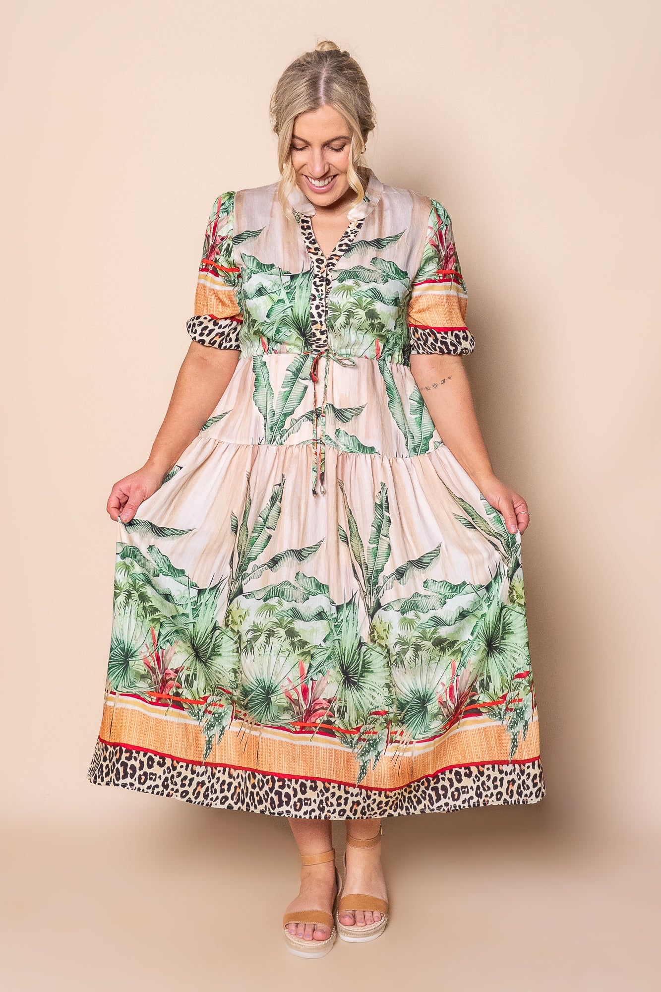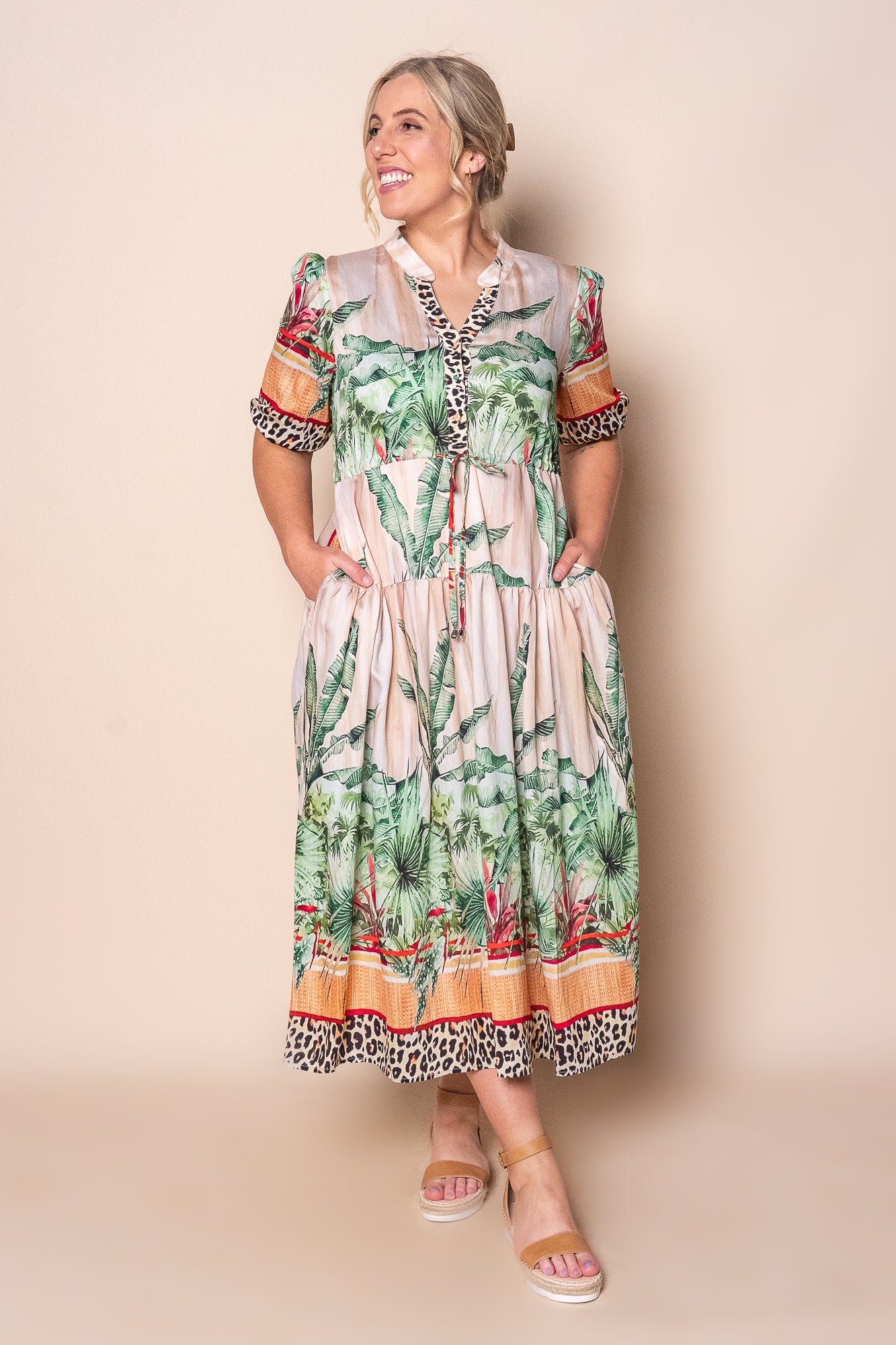 The Jesper Midi Dress combines effortless elegance with practical design. Rendered in a striking jungle leopard border print, this sophisticated piece features a flattering round V neckline and functional bust buttons. The drawstring waist defines your silhouette while side pockets offer everyday convenience. Three-quarter sleeves with elasticated cuffs provide refined polish, while the tiered skirt and midi length create graceful movement.