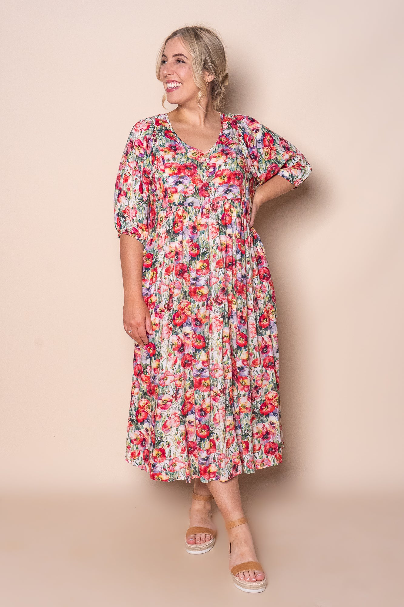The Korinna Midi Dress in Red Multi features a sophisticated floral print in red, white, mauve, green and yellow tones. Designed with a flattering V neckline and subtle faux button detailing at the bust, it offers elegance and charm. The 3/4 length sleeves with elasticated cuffs and functional side pockets combine style with practicality. Crafted from 100% rayon, this midi-length dress provides a relaxed yet refined fit, true to size.