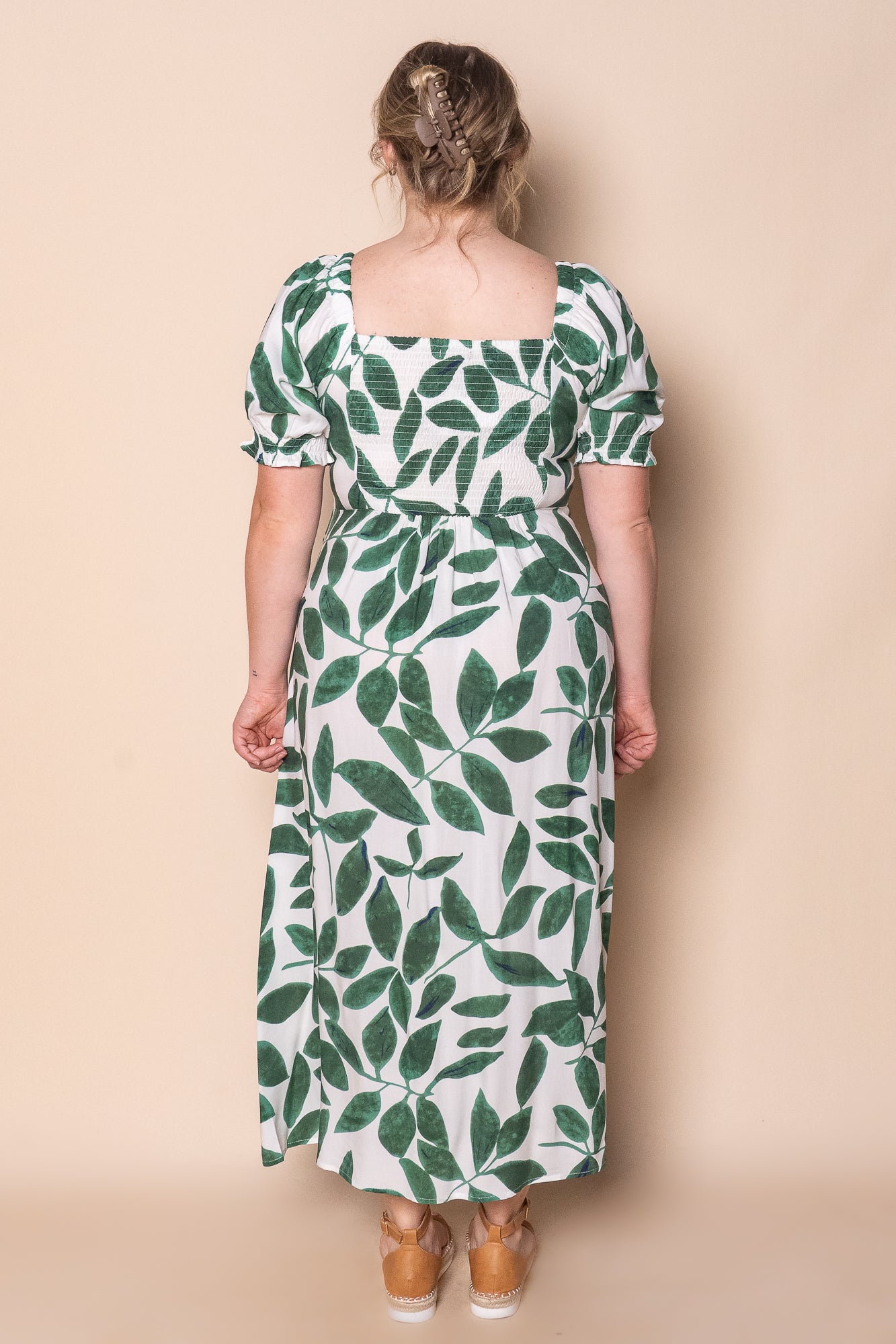 Embrace effortless elegance with the Leanna Midi Dress in Green. Featuring a beautiful leaf print, this dress boasts a sweetheart neckline accented by a charming bow, and short sleeves with elasticated cuffs for graceful comfort. The front fitted bodice and shirred back panel provide a flattering silhouette, while functional side pockets add practical sophistication. Crafted from 100% viscose, its midi length and true-to-size fit ensure versatility. Perfect for refined occasions or everyday wear.