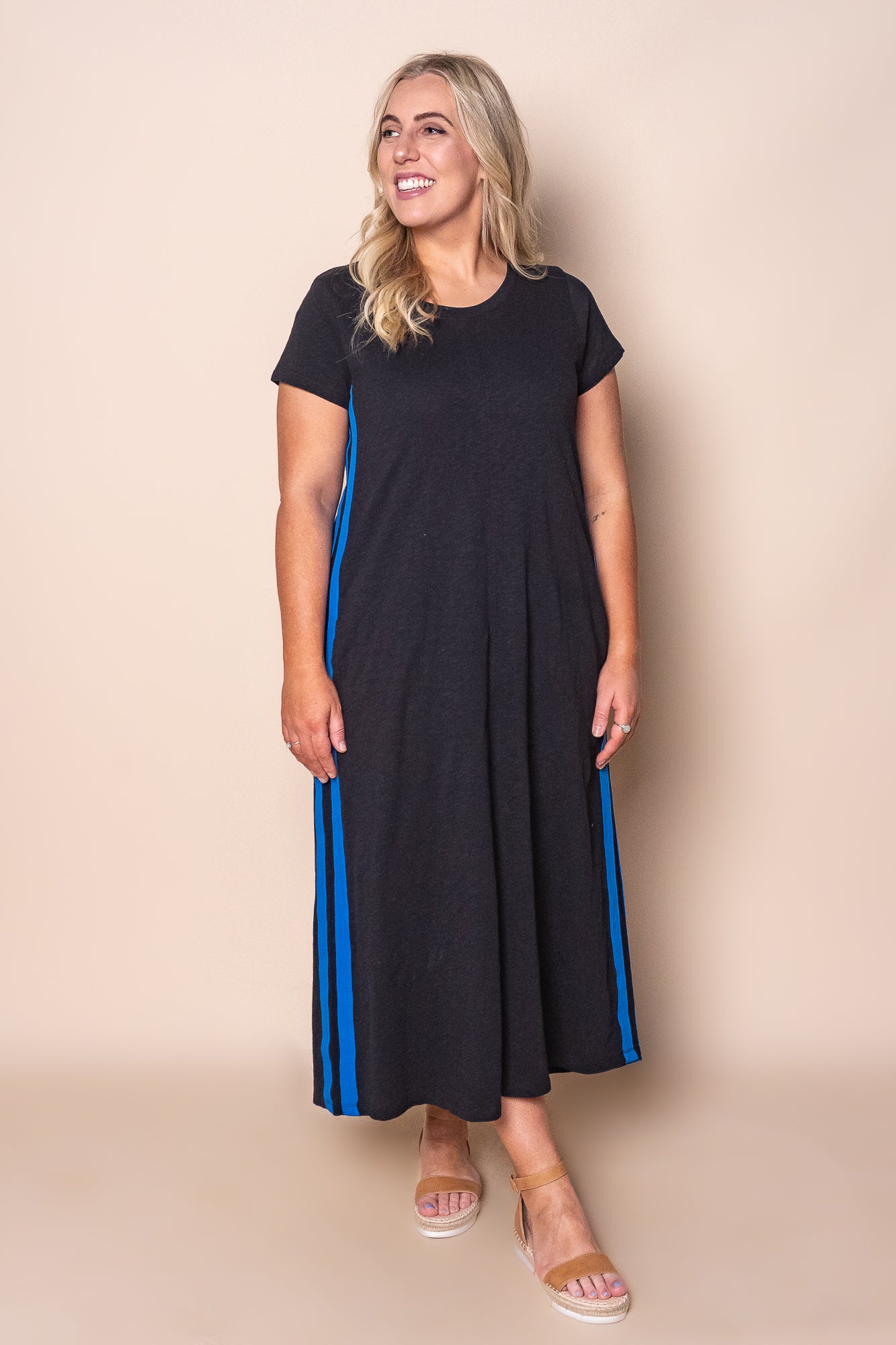 Stay stylish and comfy in the Recovery Dress in Black and Blue by Foxwood. This playful midi-length dress features charming stripe details and handy pockets for all your little essentials. Made from soft cotton, it offers breathable comfort while the round neckline adds a simple, flattering touch. Perfect for days when you want to feel relaxed but put together effortlessly.