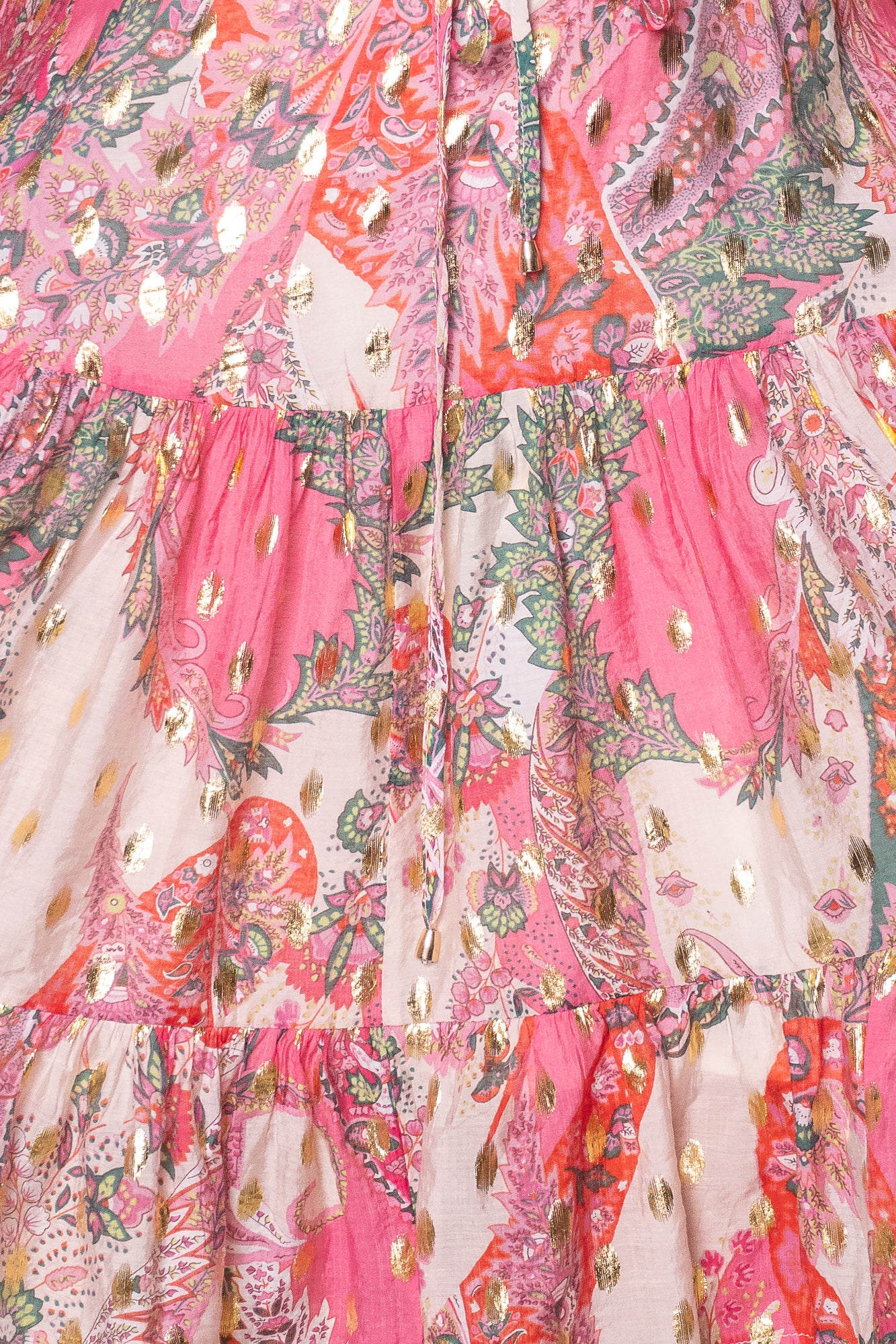 Elevate your everyday wardrobe with the Vivian Gold Metallic Floral Dress. This sophisticated piece features a stunning floral print in pink, metallic gold, green and beige tones that effortlessly transitions from day to night. The flattering V neckline and functional gold buttons at the bust create a refined silhouette, while the drawstring waist allows for a customizable fit. Short balloon sleeves with invisible elasticated cuffs add contemporary charm, and practical side pockets keep essentials within reach. The tiered skirt and full lining provide movement and comfort at knee length. Crafted from a viscose and polyester blend, this dress is true to size and available in plus sizes for an inclusive fit.