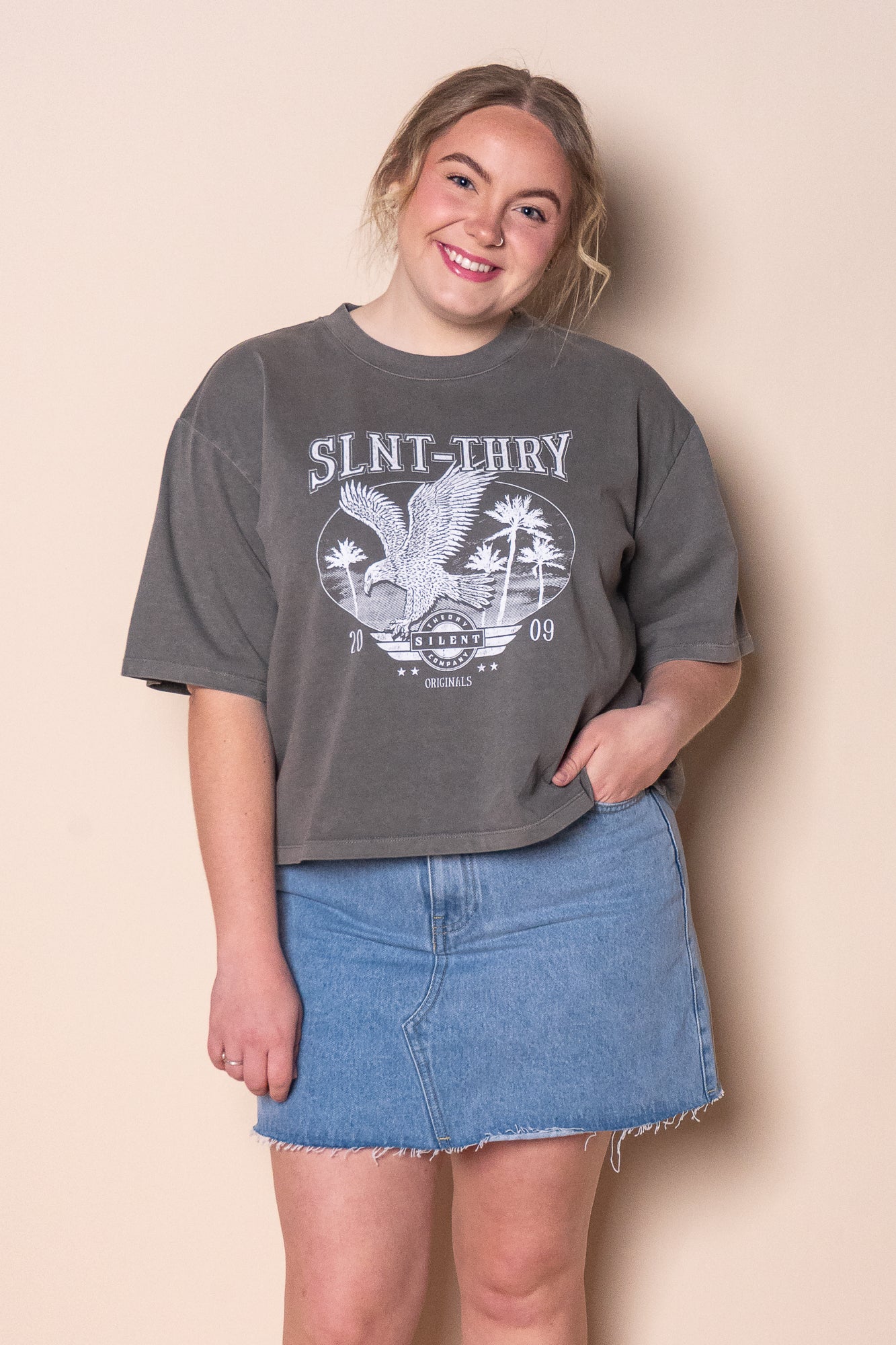 This Original Eagle Tee in Coal by Silent Theory brings cool vibes with its bold graphic print front and comfy cotton fabric. Its cropped fit and straight hemline add a cheeky, laid-back edge—perfect for mixing and matching your favourite casual looks with a playful twist.