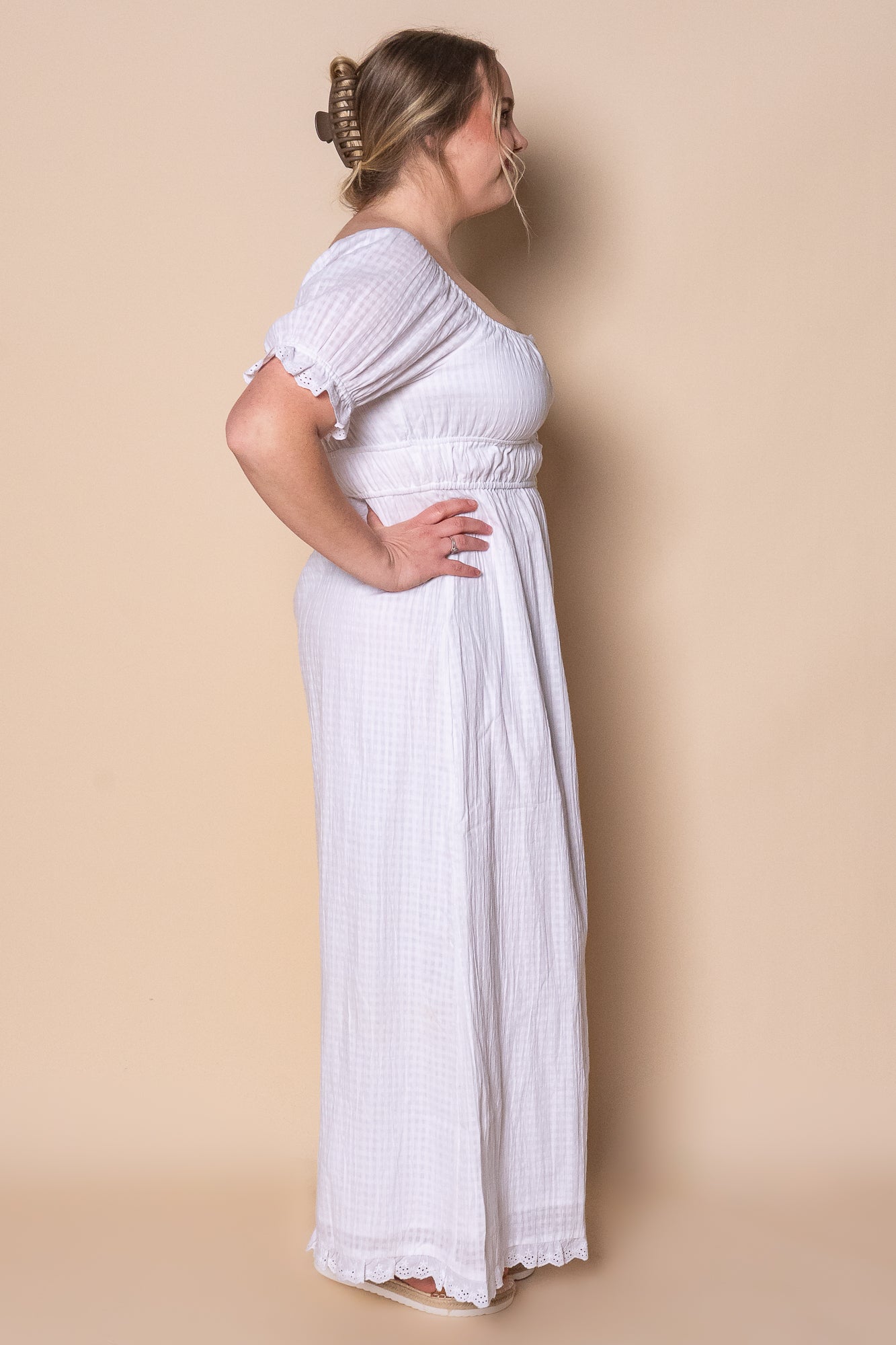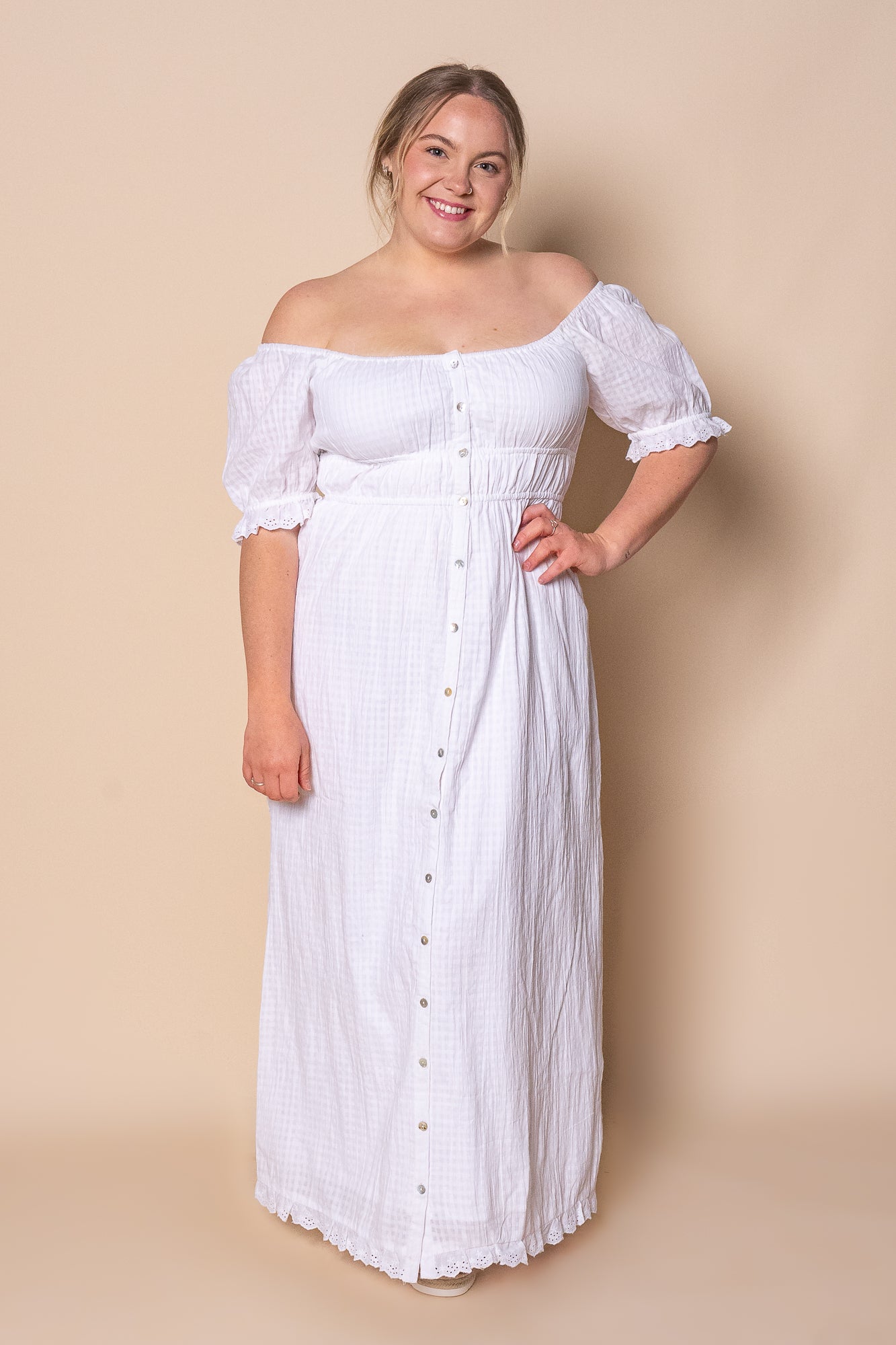 This elegant maxi dress features lightweight, crinkled cheesecloth cotton for breathable comfort. Designed with a sweetheart neckline and elasticated shoulders, it offers a flattering fit enhanced by a button-down front and a fitted underbust with an elasticated waist. Short puff sleeves with elasticated cuffs and lace frills add a delicate touch, while the fully lined construction ensures modesty. True to size and available in plus sizes, this dress combines sophisticated style with effortless wearability. Perfect for any occasion, it gracefully complements your silhouette in timeless white.