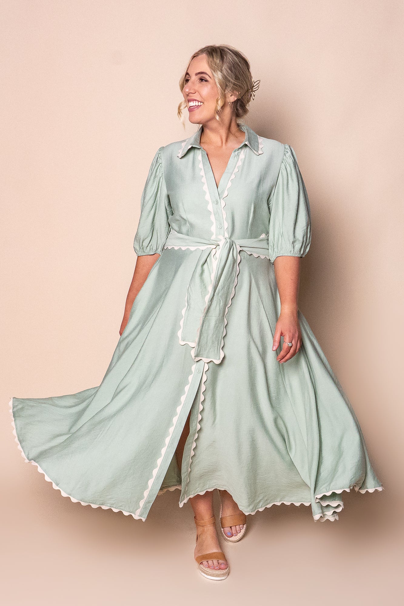 The Sherry Midi Dress combines timeless elegance with playful detail. Crafted from a viscose and polyester blend, this mint green dress features a refined collared V-neckline and button-down front, paired with charming white ric rac trim. The fitted bodice flows into a graceful A-line skirt at midi length, while short sleeves with elasticated cuffs add polish. Functional belt loops and a detachable waist tie allow you to define your silhouette. True to size and available in plus sizes, this versatile piece transitions effortlessly from day to evening.