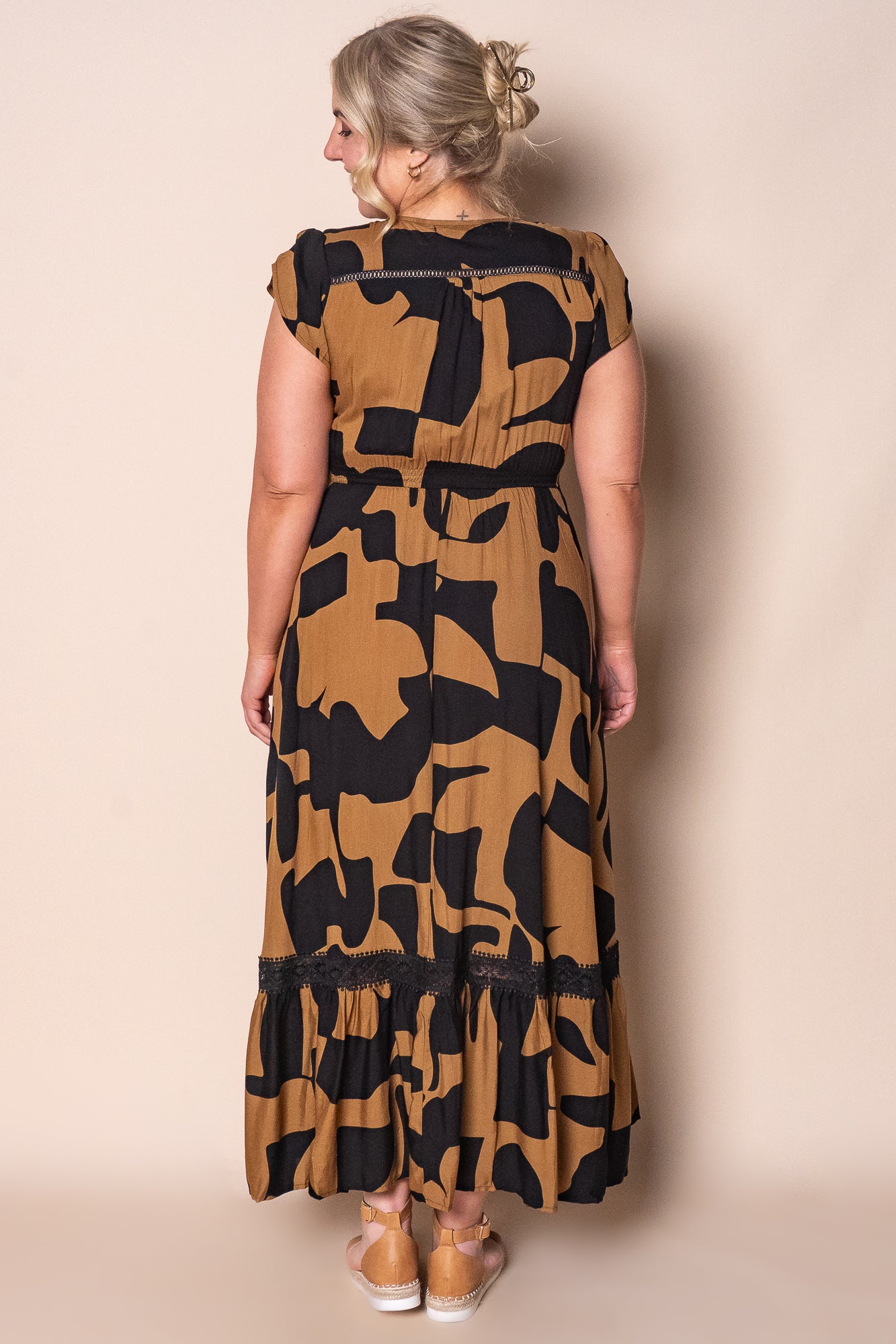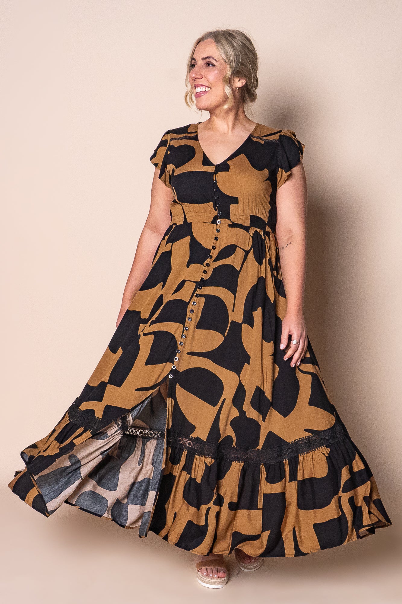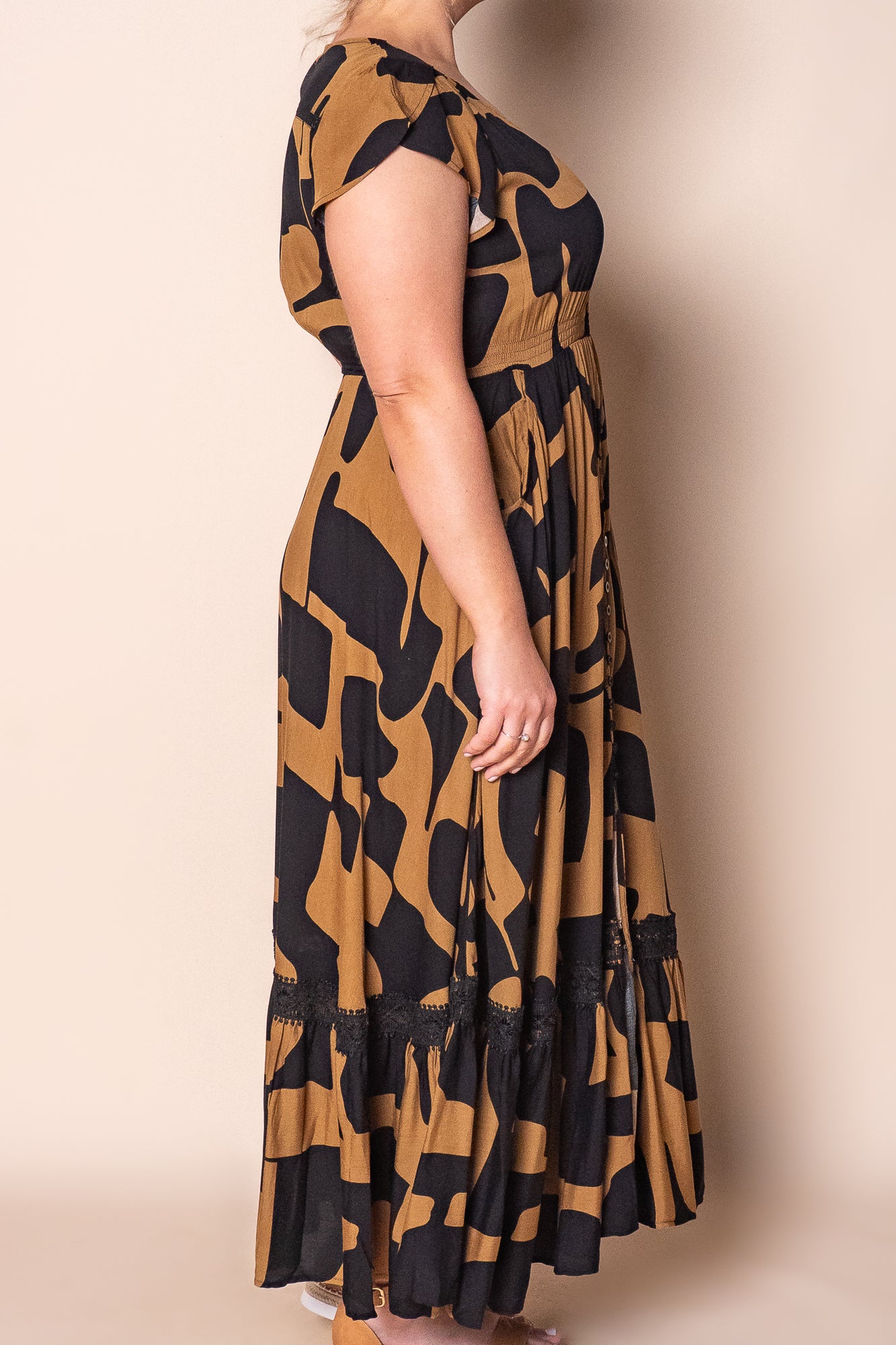 Embrace effortless elegance with the Omara Maxi Dress in Black. Featuring an abstract print and delicate lace trim, this maxi-length dress showcases a flattering V neckline and short cap sleeves. The elasticated waistline enhances your silhouette, while functional button-down front, hip pockets, and a front skirt split offer practical style. Crafted from 100% viscose, it delivers a comfortable, breathable fit. True to size and available in plus sizes, the Omara dress combines sophisticated design with versatile wearability.