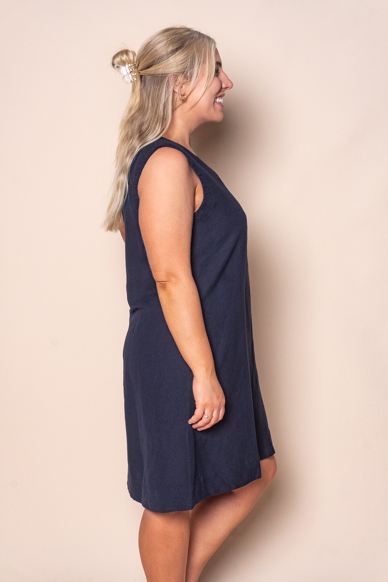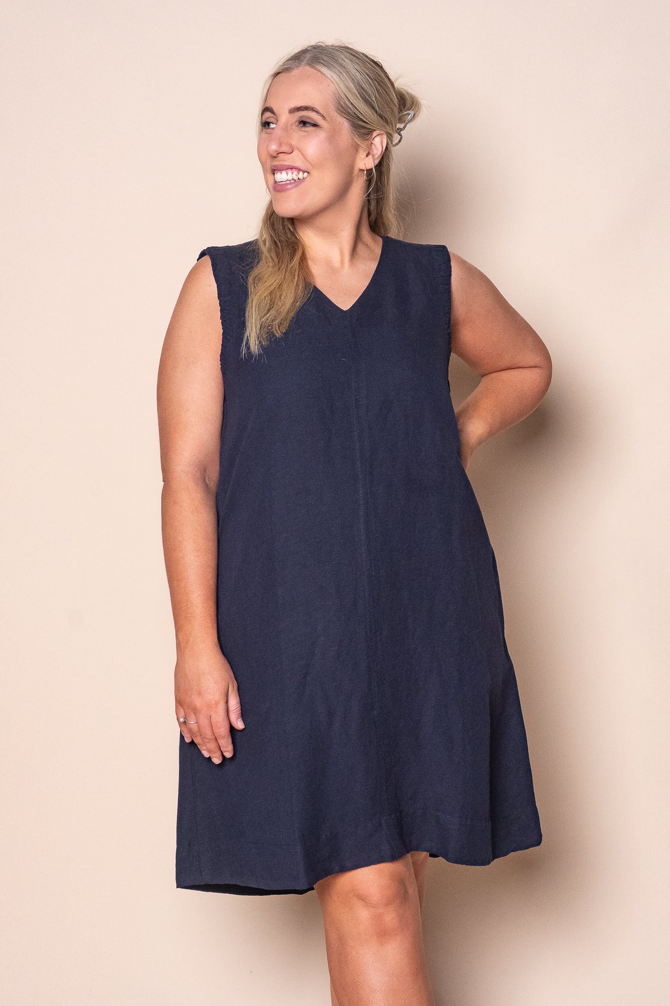 Effortless elegance meets everyday practicality in this navy linen blend dress. The sleek knee-length silhouette flatters all figures, while decorative armholes add a touch of contemporary style. Breathable linen keeps you cool through warm Australian days, and functional side pockets mean you'll never search for somewhere to stash your essentials. Perfect for casual outings, weekend brunches, or dressed up with accessories for something more polished. A versatile wardrobe staple that transitions seamlessly from season to season.