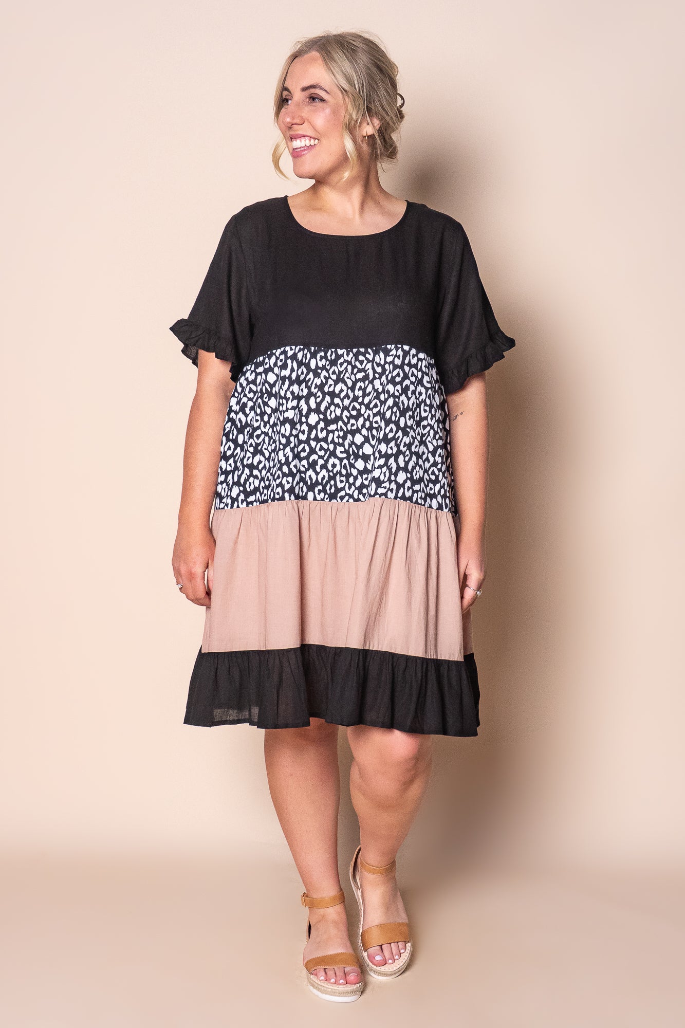 The Nigella Dress in Black features a striking combination of black, beige, and white with an elegant animal print panel. Crafted from a viscose-linen blend with polyester contrast, this dress offers both comfort and style. It highlights a round neckline and short sleeves adorned with delicate ruffle detailing. Designed with functional side pockets and a relaxed, true-to-size fit, it provides versatility for any occasion. For a more tailored silhouette, consider sizing down. Available in a wide range of sizes, including plus, the Nigella Dress balances sophistication with effortless wearability.