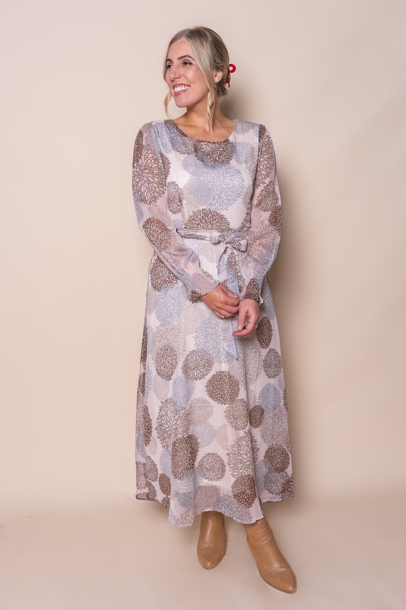 Elevate your evening wardrobe with the Fortuna Gold Foil Maxi Dress in Blush. This stunning piece features a delicate fabrication adorned with a floral print in blush, beige, metallic gold, chocolate and grey tones. The fitted bodice is complemented by an elegant A-line skirt that flows to maxi length, while long sleeves with shirred elasticated cuffs add refined detail. A round neckline and back zipper fastening ensure a polished finish. Fully lined for comfort and true to size, this dress is perfect for special occasions and sophisticated gatherings.