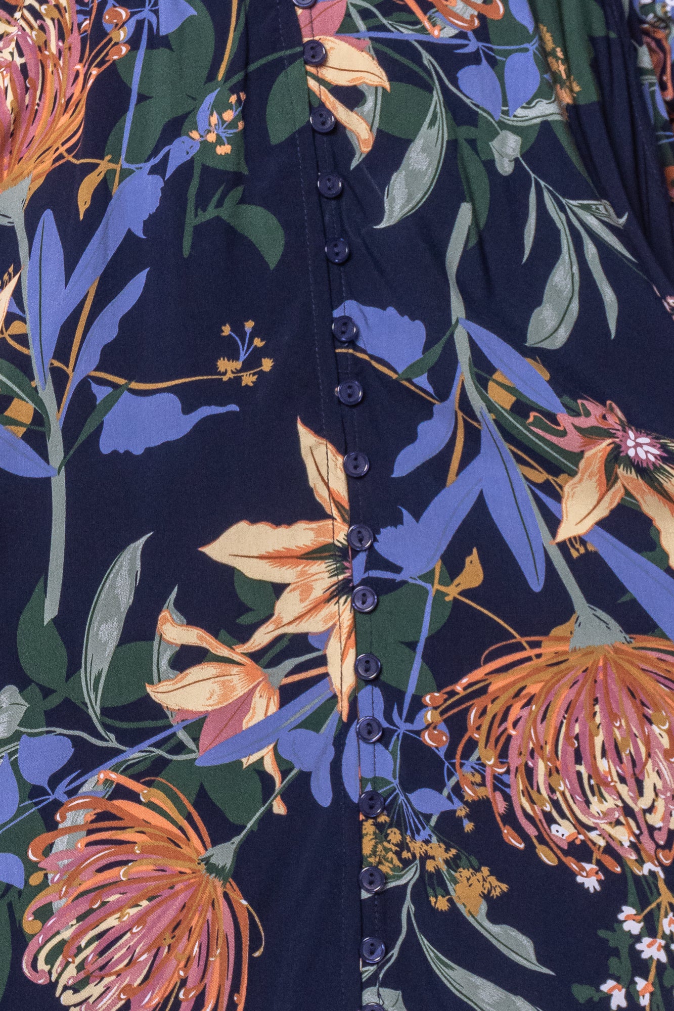 The Tiffany Maxi Dress epitomises understated luxury with its carefully curated design. A harmonious floral print in navy, green, periwinkle, tan and white creates visual interest across the fabric, while the refined V neckline offers a flattering silhouette. Functional buttons at the bust provide styling flexibility, and three-quarter sleeves with elasticated cuffs balance structure with ease of movement. The elasticated waistband delivers comfort without sacrificing shape, whilst practical front hip pockets prove that sophistication needn't compromise on utility. Delicate lace accents and a subtle front split add graceful dimension to this maxi length piece, a dress designed for the discerning wearer who values both beauty and practicality.