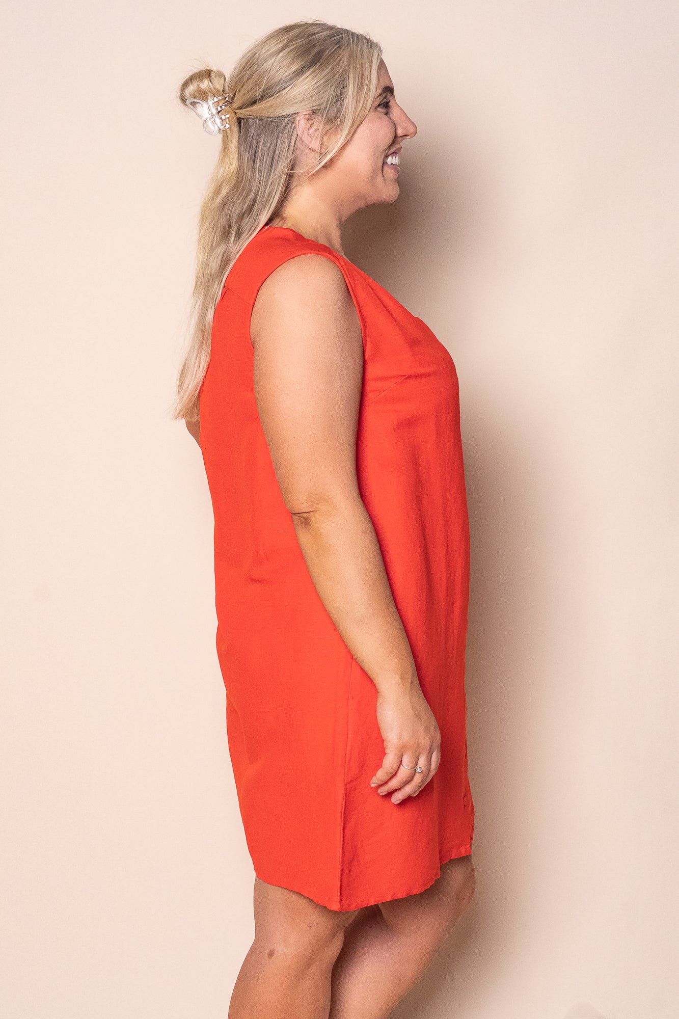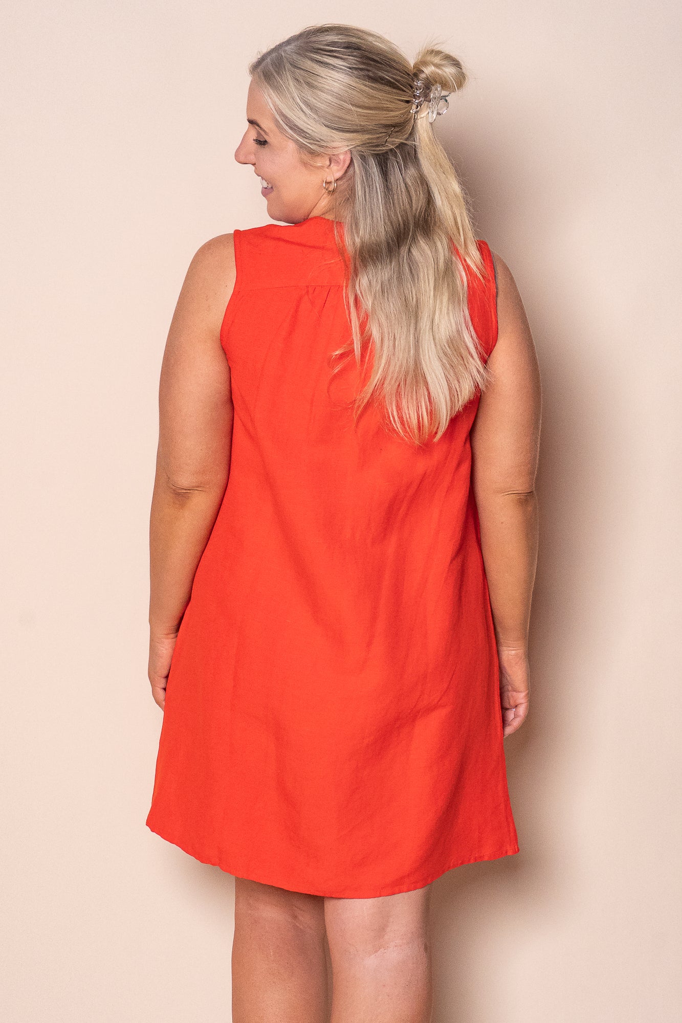The Anara Dress in Tangelo is a timeless wardrobe essential crafted from a breathable linen-viscose blend. This sleeveless design features a flattering V neckline and button-down front, while the A-line silhouette skims the body for effortless elegance. Functional side pockets add practical appeal, and the knee-length cut offers versatile styling for any occasion. True to size with a relaxed fit, it's available in extended sizing to suit all figures.