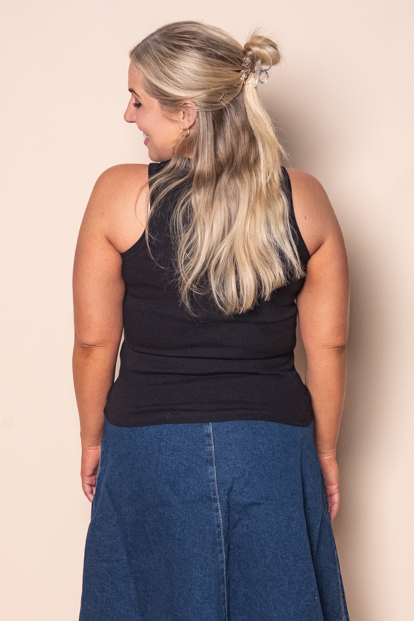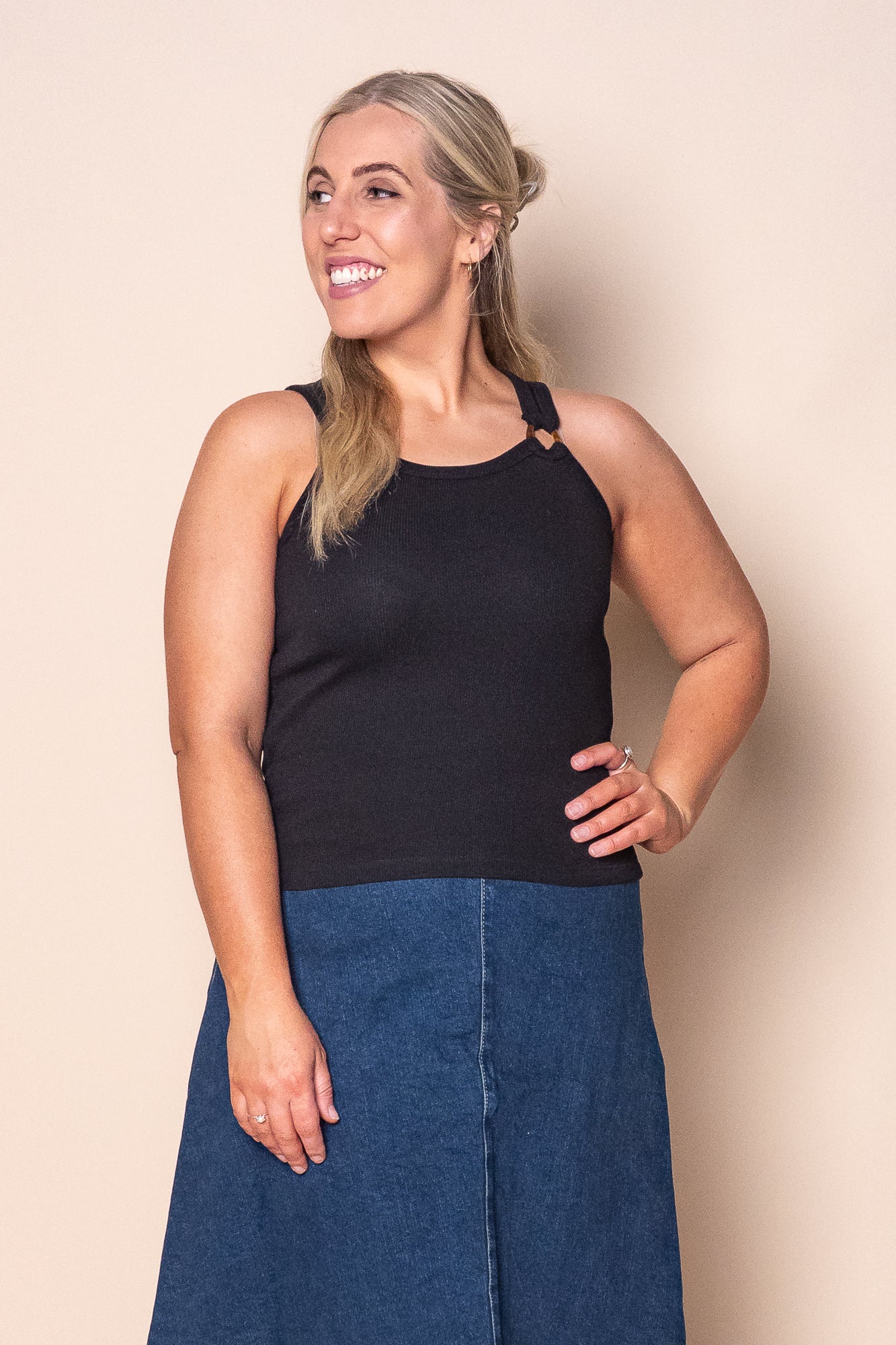 The Sierra Tank in Black is your new go-to for effortless cool. Crafted from a soft cotton blend with ribbed, stretchy fabric, it hugs your curves just right while keeping you comfy all day. The playful hardware strap detail adds a little edge to this timeless staple — perfect for mixing, matching, and making every outfit pop.