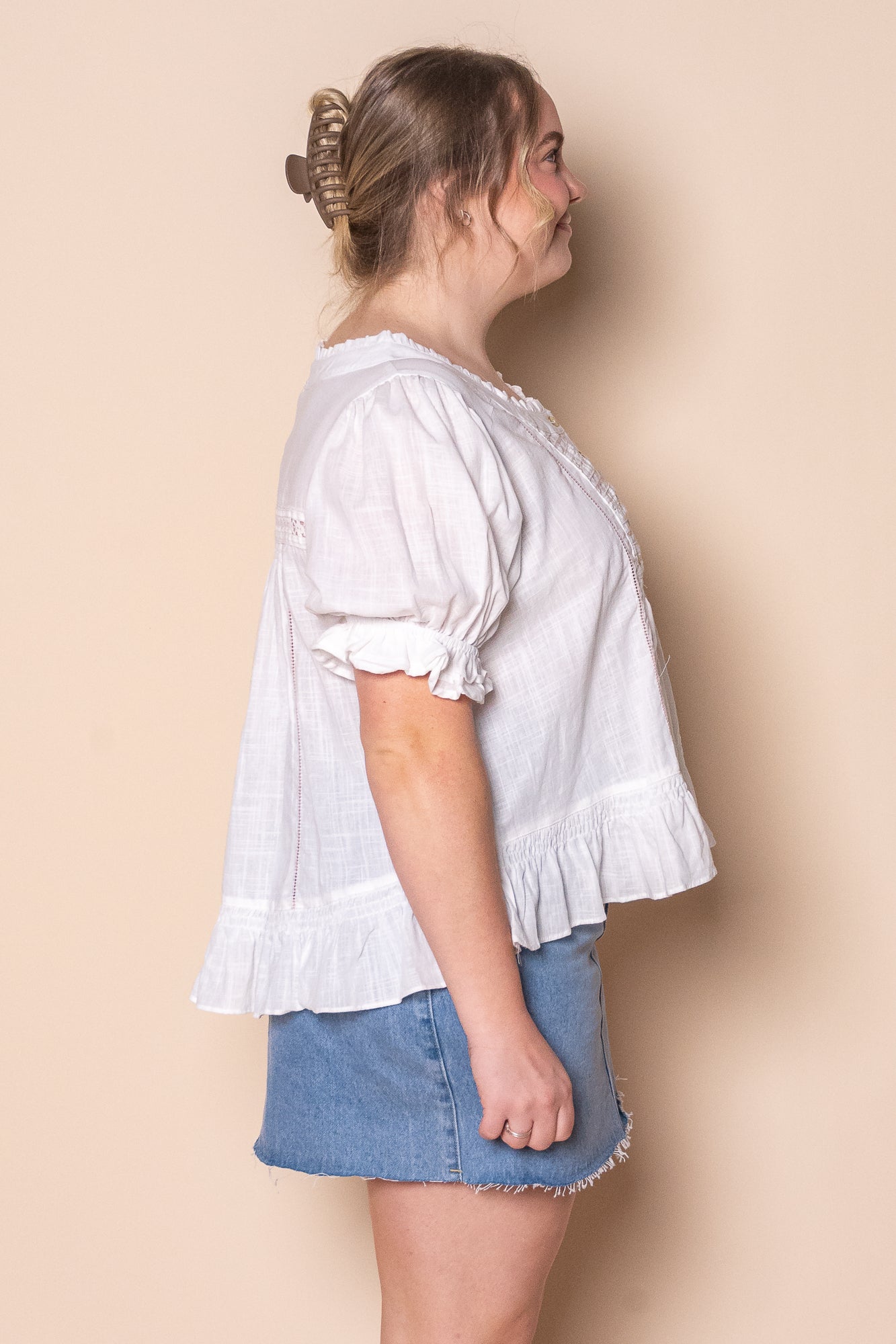 Elevate your wardrobe with the Francesco Embroidered Lace Top in White. Crafted from 100% textured cotton, it features a wide round neckline and delicate ruffle detailing for a refined touch. Soft pink embroidery and white lace accents enhance its sophisticated appeal, while functional buttons at the bust add subtle charm. The short puff sleeves with elasticated cuffs and relaxed fit ensure comfort, with a straight hemline finished with gentle ruffles. Perfect for a graceful, elegant look.