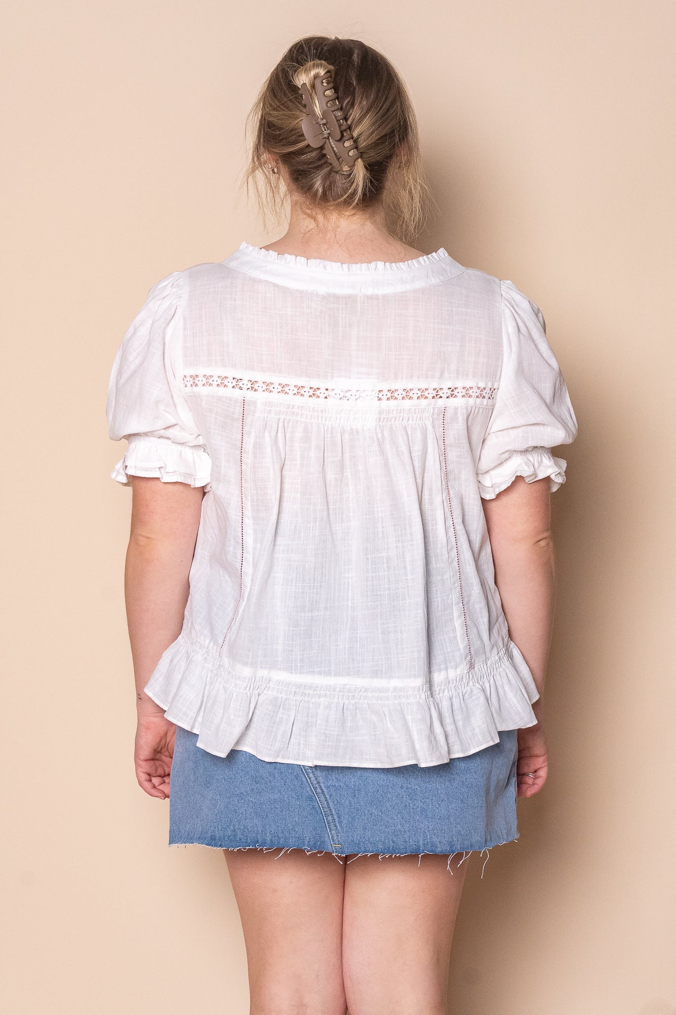 - Wide round neckline with ruffle detailing