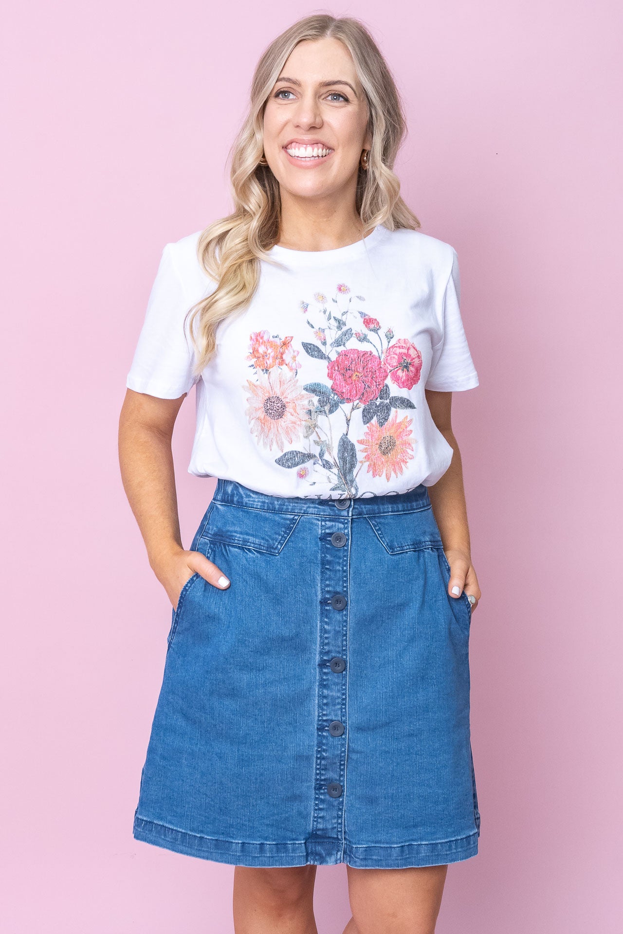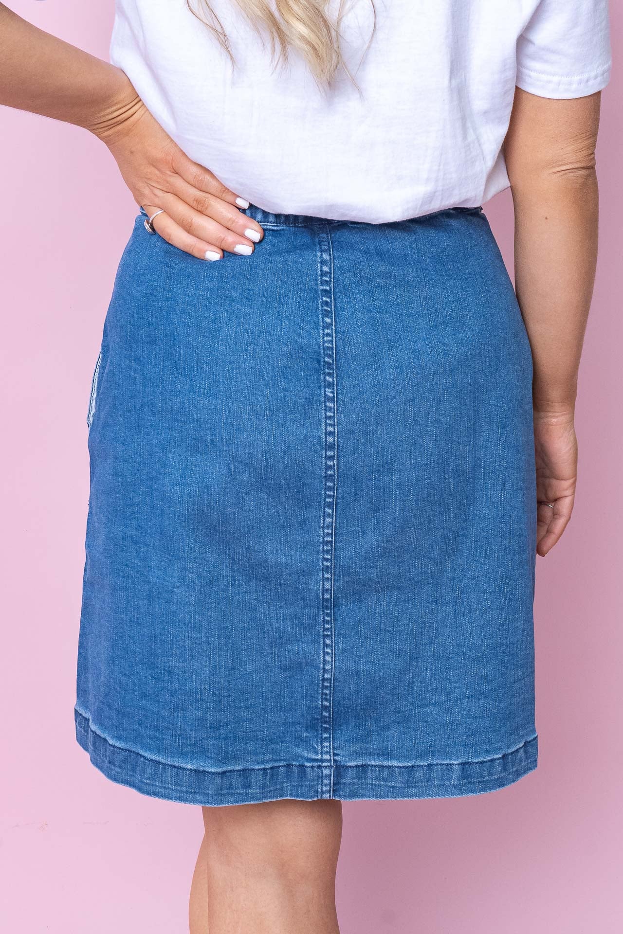 The Amanda Skirt in Mid Blue by Foxwood combines timeless denim craftsmanship with a refined silhouette. Crafted from a soft cotton blend with a hint of elastane, it offers comfort and subtle stretch. Its high-waisted, A-line design features an elasticated back waistband for a tailored fit, functional hip pockets, and a row of buttons down the front, all detailed with matching mid blue stitching. Falling just above the knee, this skirt is true to size and effortlessly elevates any wardrobe with understated elegance.