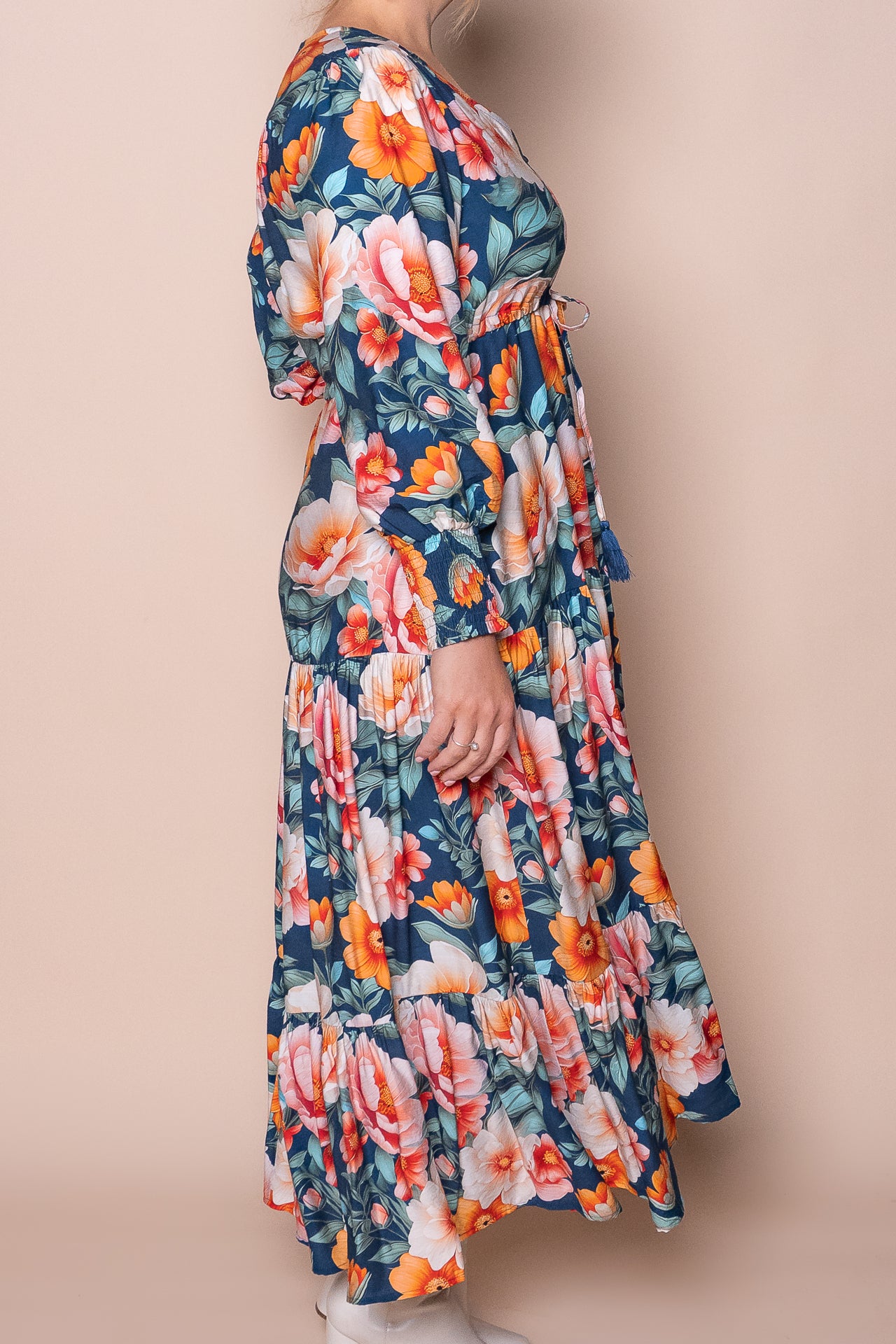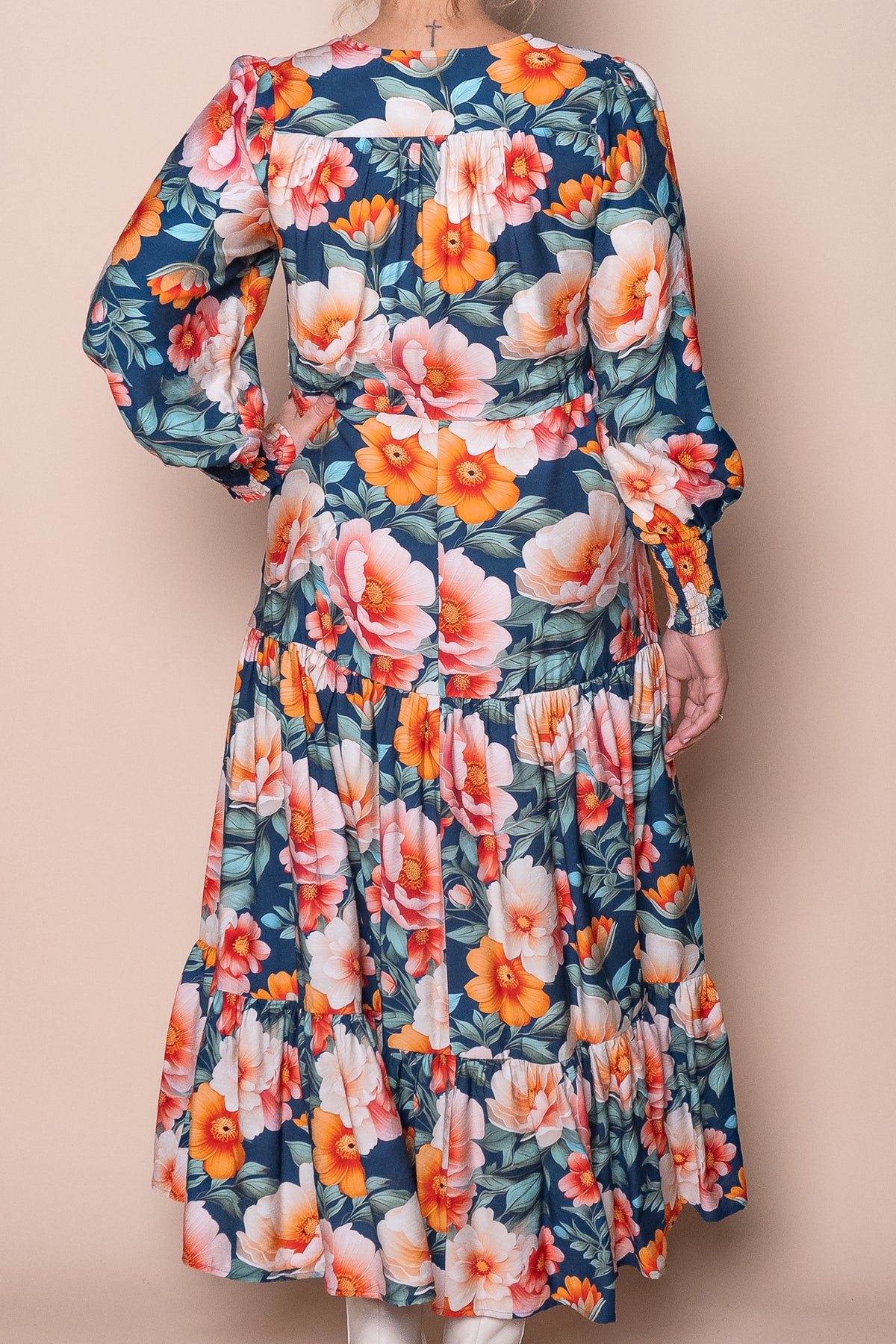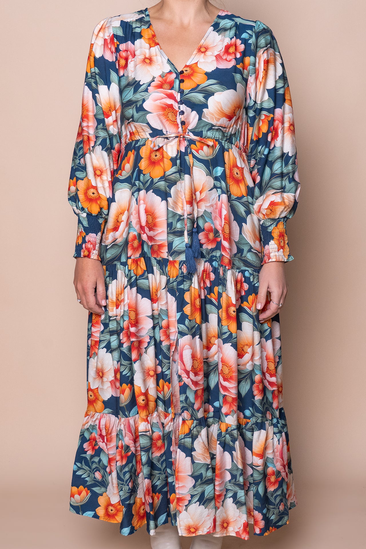 Indulge in the luxurious beauty of the Audrina Dress in Teal. This stunning floral print dress features a V neckline, long balloon sleeves, and elasticated shirred cuffs for a comfortable and stylish fit. Complete with functional buttons, a drawstring waist, and a tiered skirt, this midi dress is perfect for any occasion. Plus, with functional side pockets and a front split detail, this dress combines both fashion and functionality. Crafted from a blend of viscose and polyester, this dress is true to size and exudes elegance and sophistication.