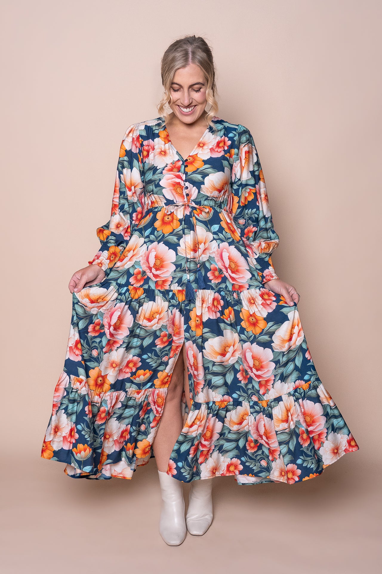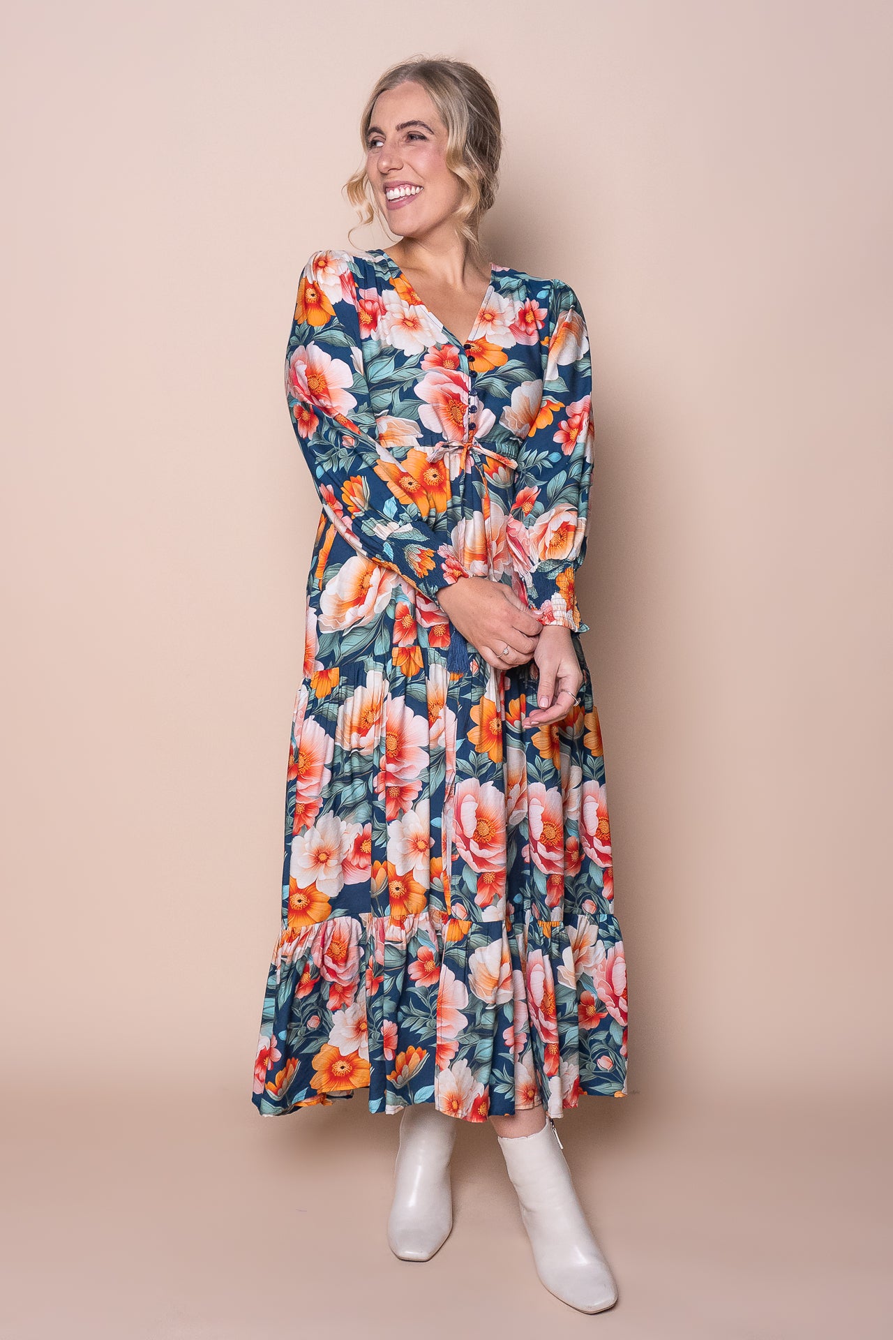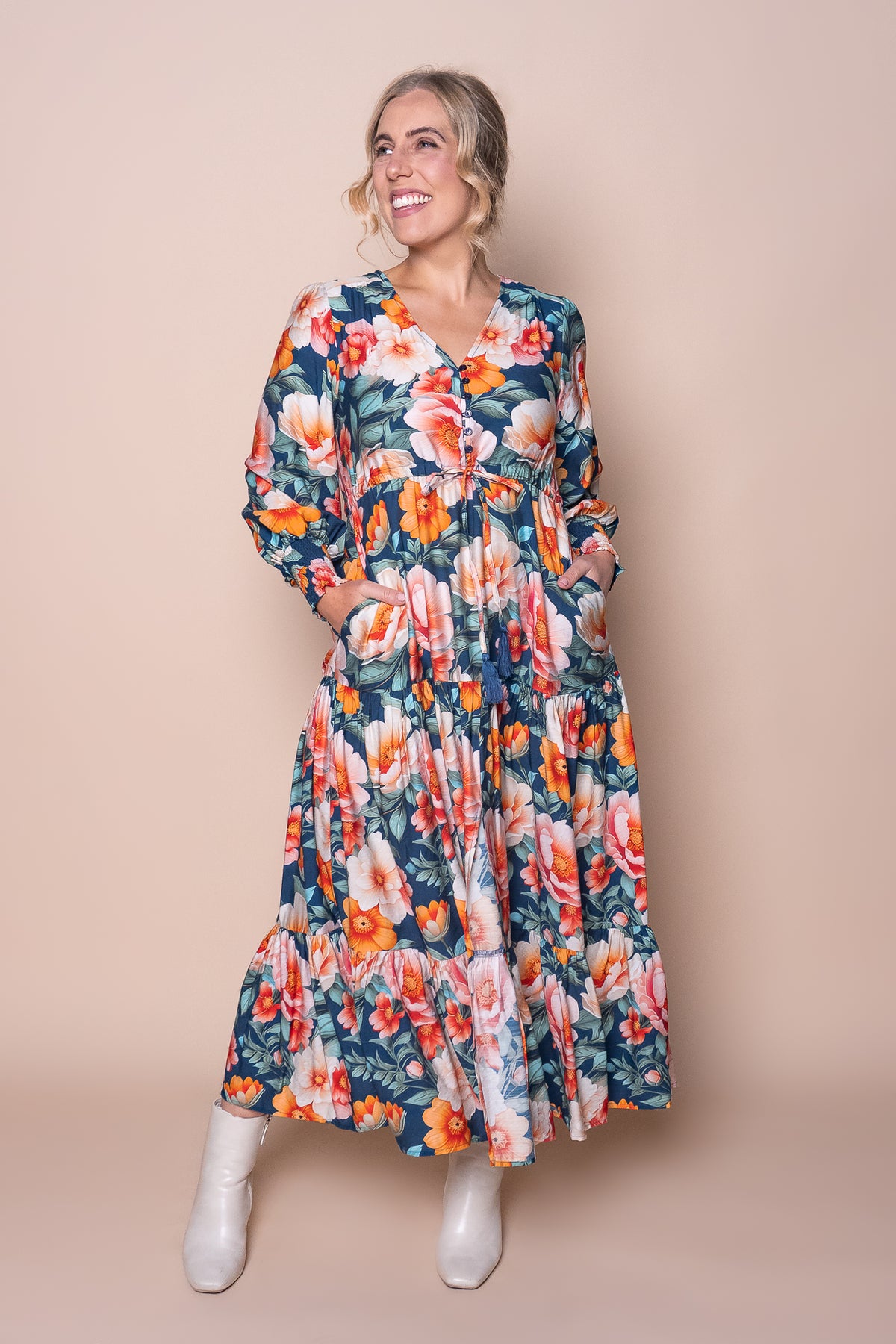 Indulge in the luxurious beauty of the Audrina Dress in Teal. This stunning floral print dress features a V neckline, long balloon sleeves, and elasticated shirred cuffs for a comfortable and stylish fit. Complete with functional buttons, a drawstring waist, and a tiered skirt, this midi dress is perfect for any occasion. Plus, with functional side pockets and a front split detail, this dress combines both fashion and functionality. Crafted from a blend of viscose and polyester, this dress is true to size and exudes elegance and sophistication.
