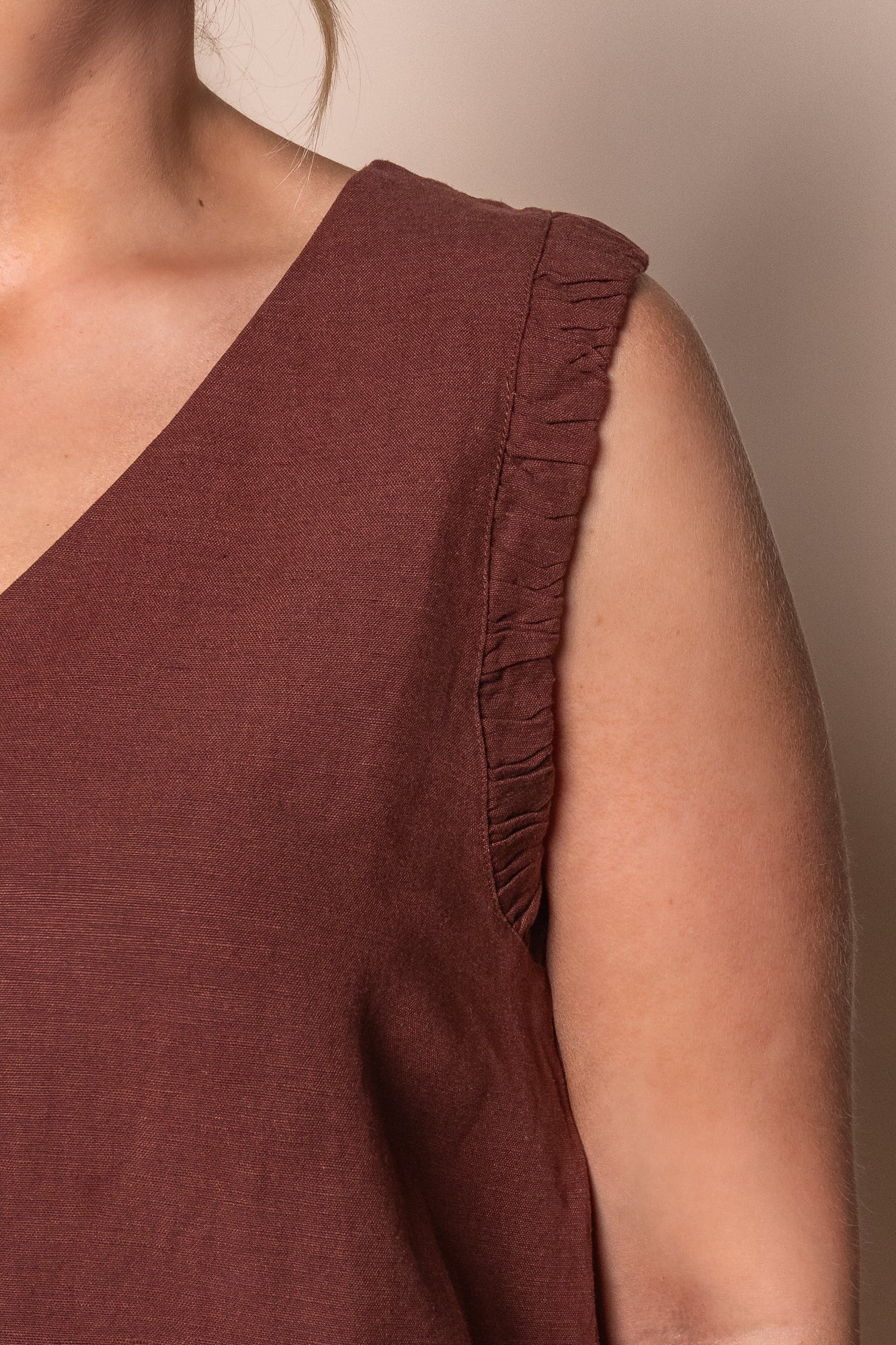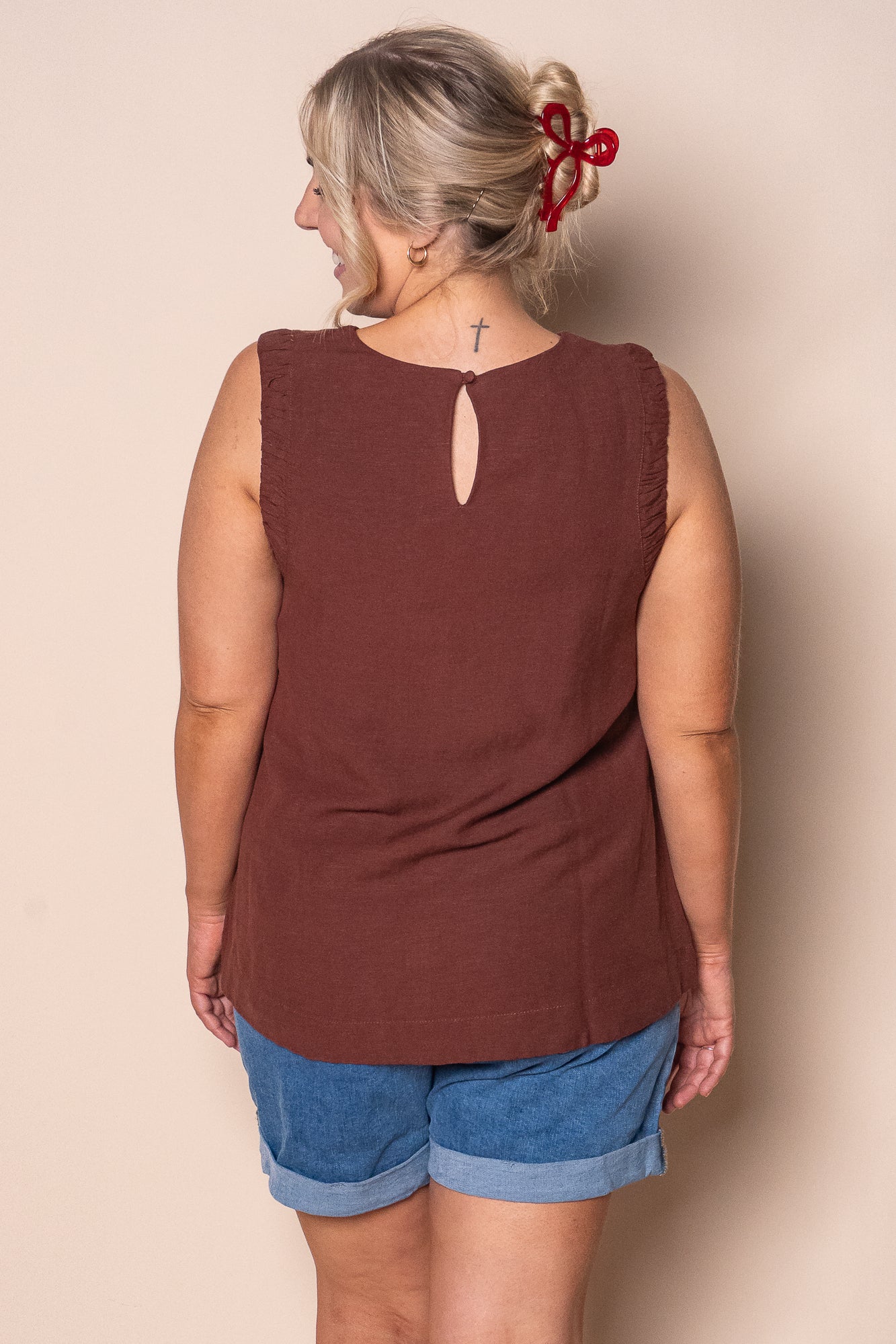 Effortlessly chic, this chocolate brown sleeveless top is your new warm-weather essential. Crafted from a breathable linen blend, it features a flattering V neckline and eye-catching decorative armhole detailing that adds just the right amount of personality. Perfect for layering or wearing solo, it's the kind of piece that works as hard as you do—from casual weekends to dressed-up dinners. Versatile, comfortable, and undeniably stylish.
