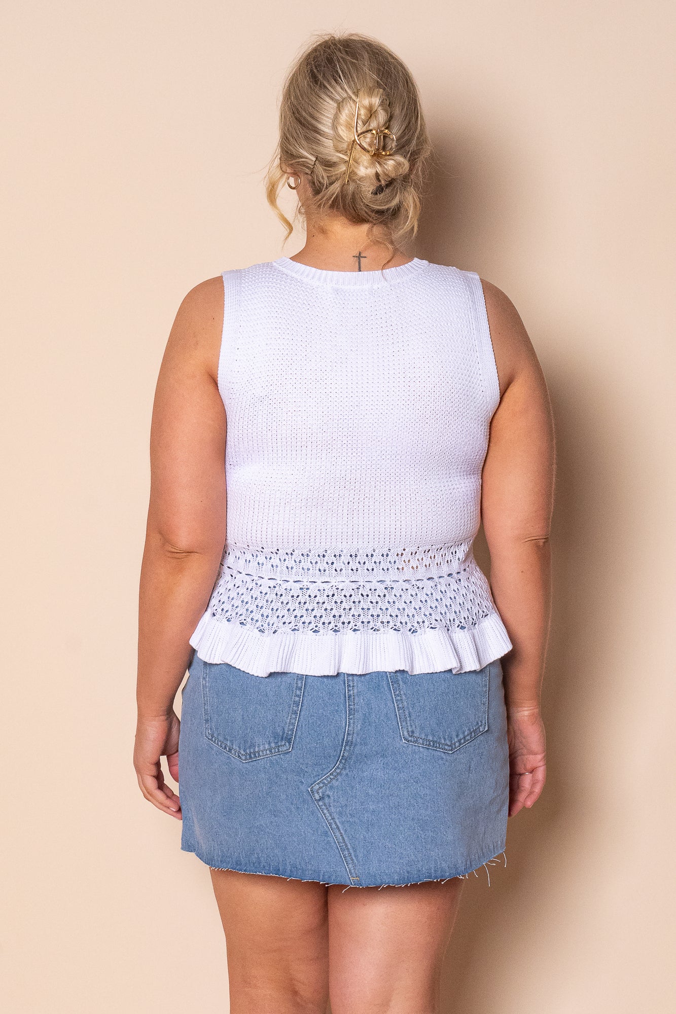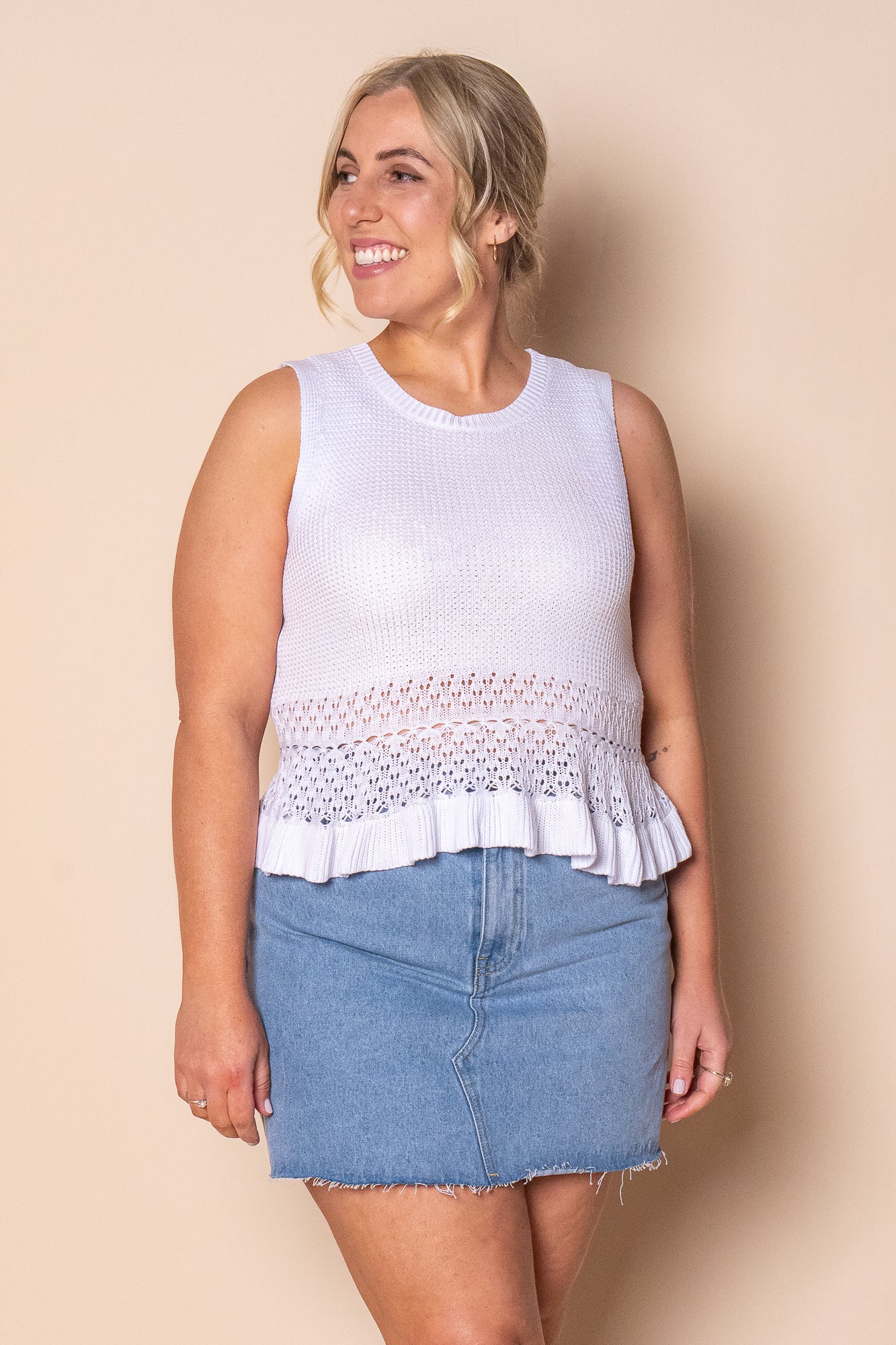Elevate your wardrobe with the Catalina Top in White, crafted from soft 100% cotton crochet knit for a delicate, breathable feel. Featuring a refined round neckline and sleeveless design, it offers effortless elegance. The straight hemline is enhanced with subtle ribbed ruffle detailing, adding a touch of sophistication to this versatile piece. Perfect for layering or wearing alone, it combines comfort with timeless style.