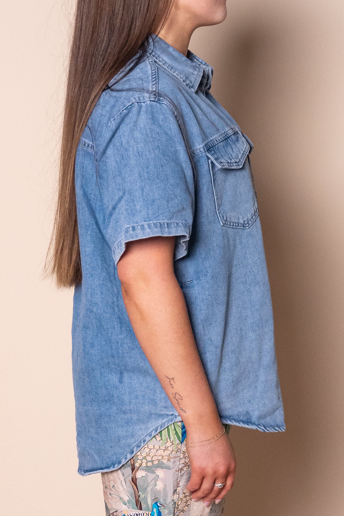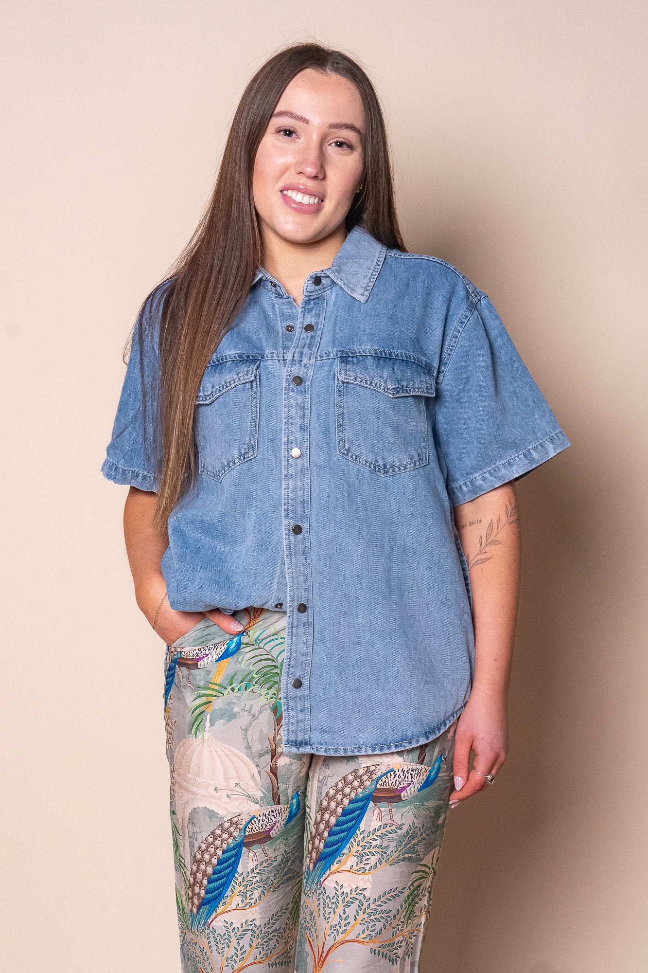 Elevate your casual wardrobe with the Daisy S/S Shirt in Light Blue by Foxwood. Crafted from 100% cotton washed denim, this collared shirt features a button-down front with press studs and chest pockets for refined detail. Its short sleeves and curved hi/lo hemline offer a flattering silhouette in a regular, true-to-size fit. Functional side hip pockets and matching light blue stitching complete this versatile piece, perfect for effortless sophistication.