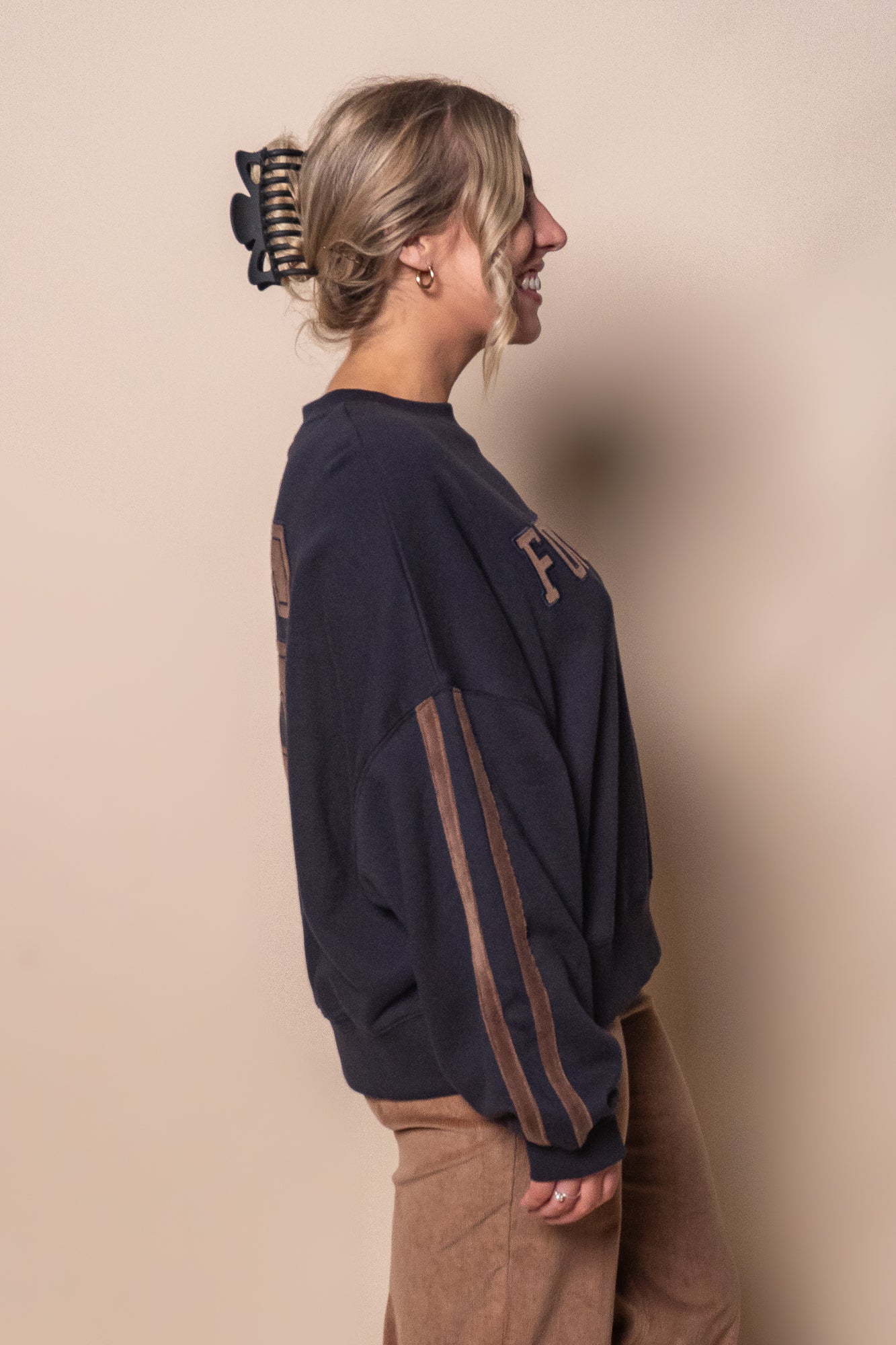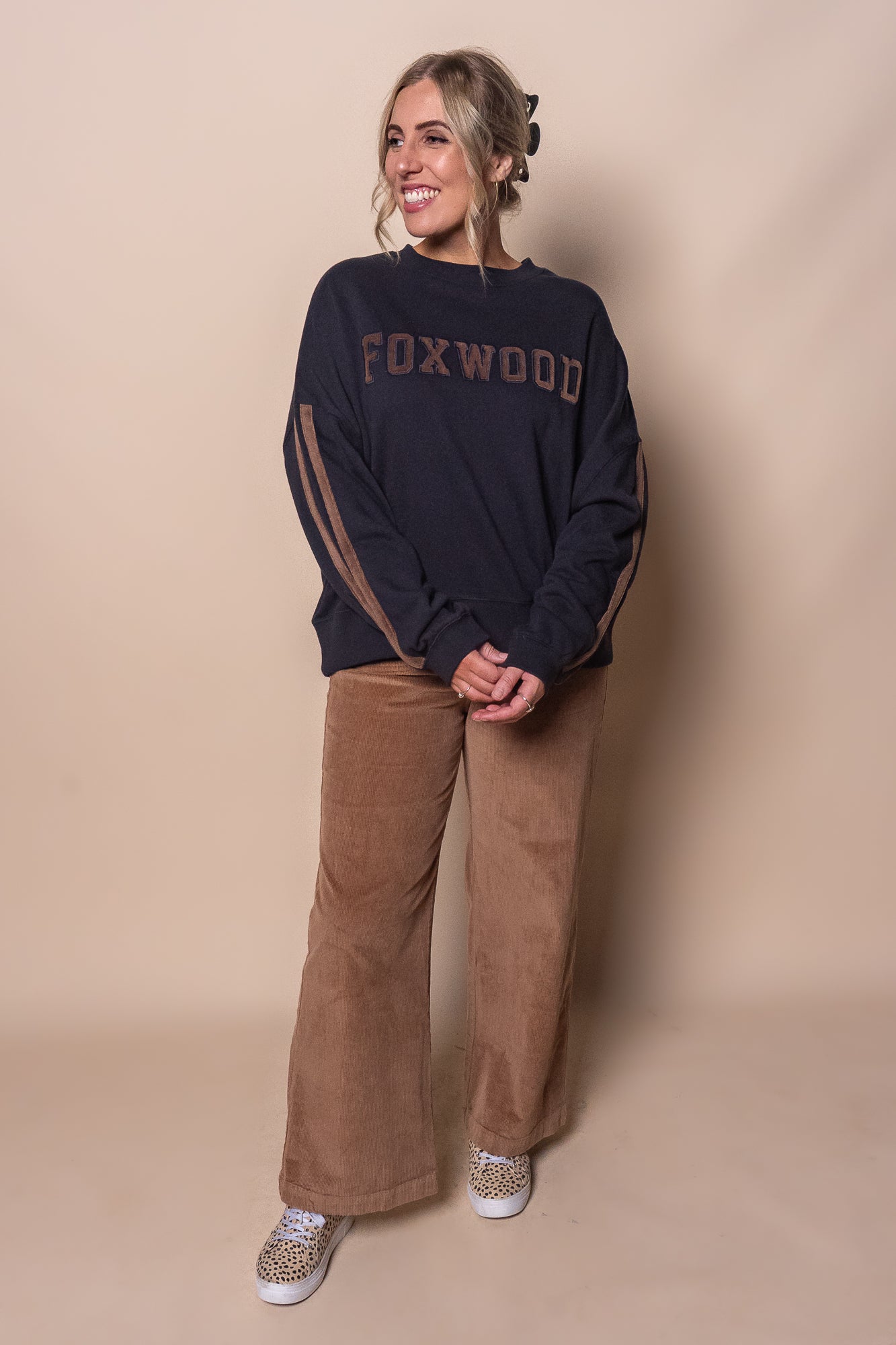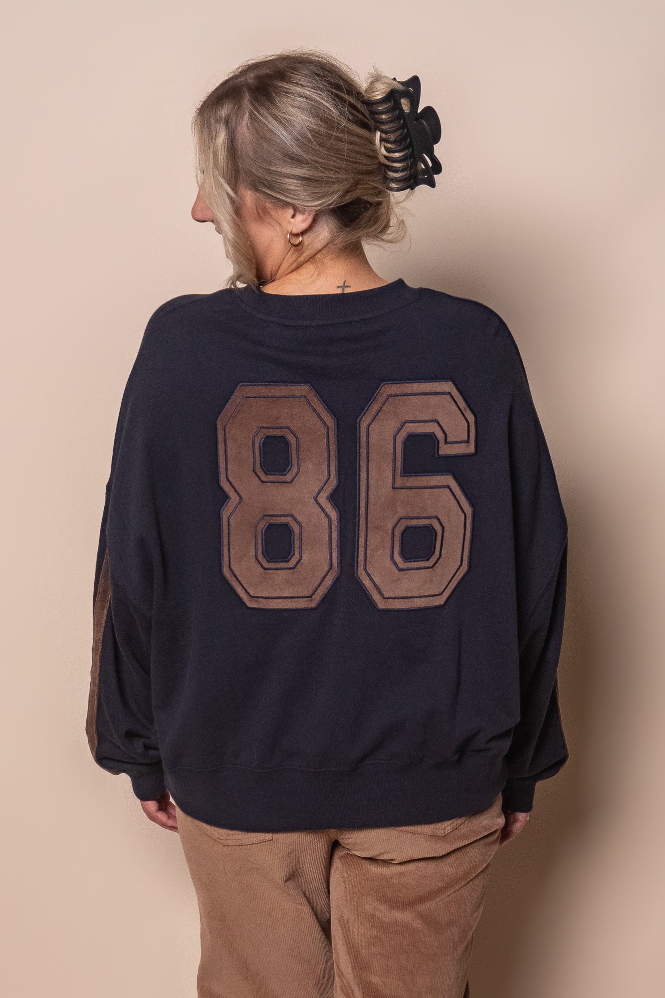 The Elevated Sunday Crew in Ink is your go-to layer for effortless style. Crafted from brushed fleece, this crew neck jumper delivers comfort without compromise. The Foxwood logo sits proudly on the front, while vintage-inspired brown stripes run down the arms. A bold '86' graphic on the back adds character and edge. Long sleeves and a straight hemline create a relaxed, contemporary silhouette that works from weekend hangouts to casual weekday moments. Timeless, versatile, and made to last.