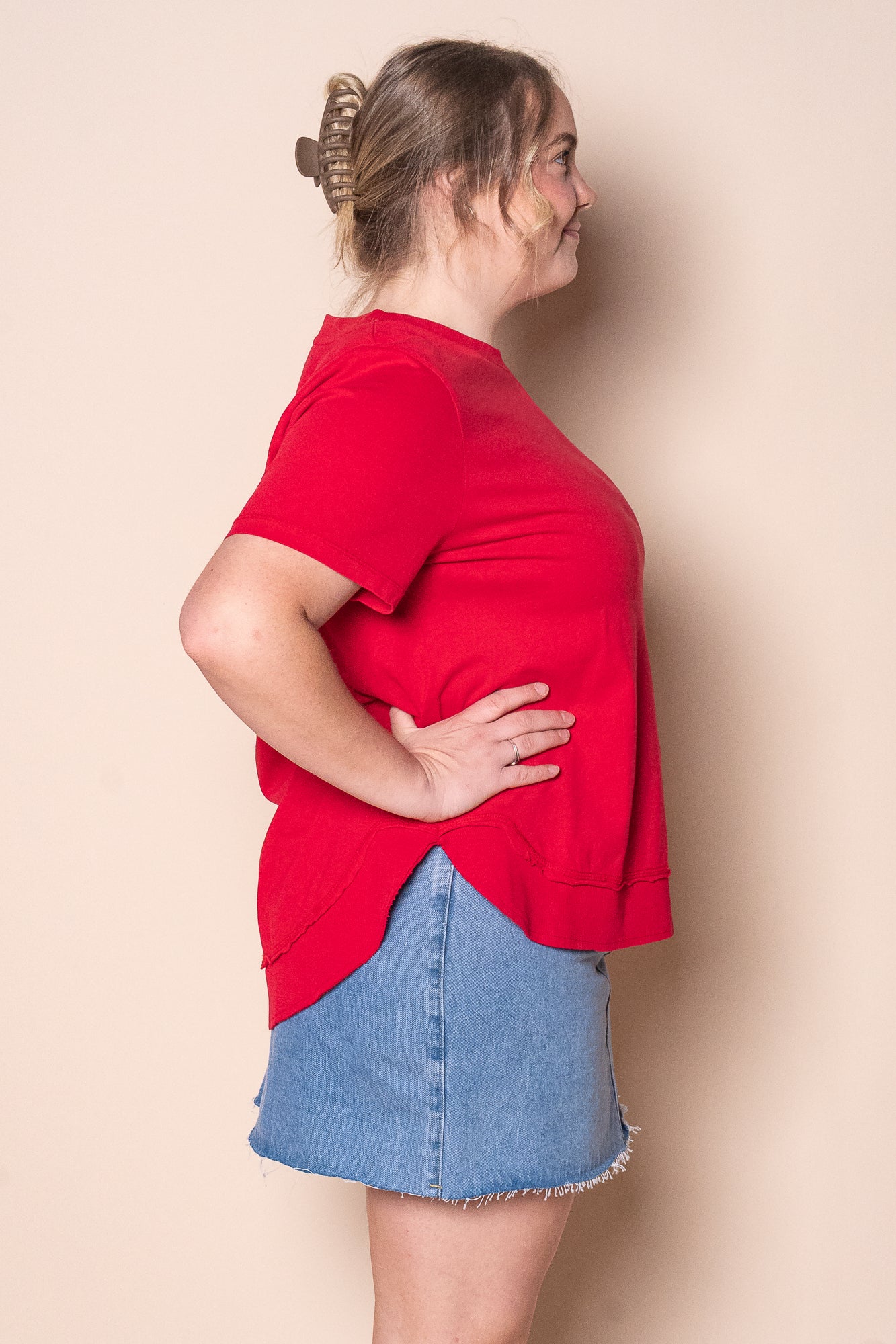 Stay stylish and comfortable in the Farrah Short Sleeve Tee by Foxwood. Made with soft and breathable cotton, this crimson red top features a classic round neckline and a trendy scoop hemline. Perfect for any occasion, this tee will elevate your basics wardrobe and keep you feeling comfortable.
