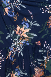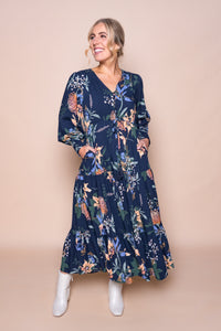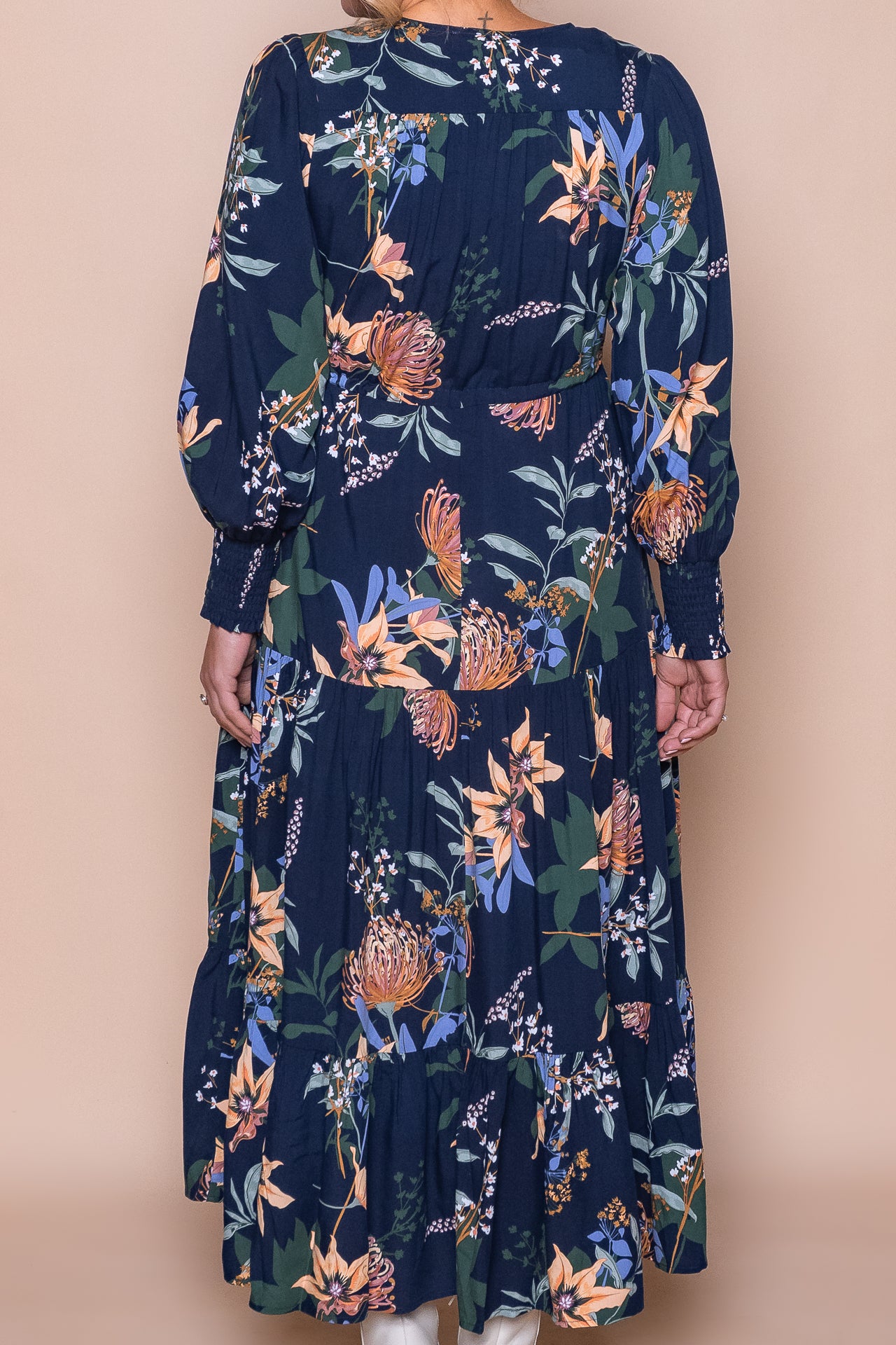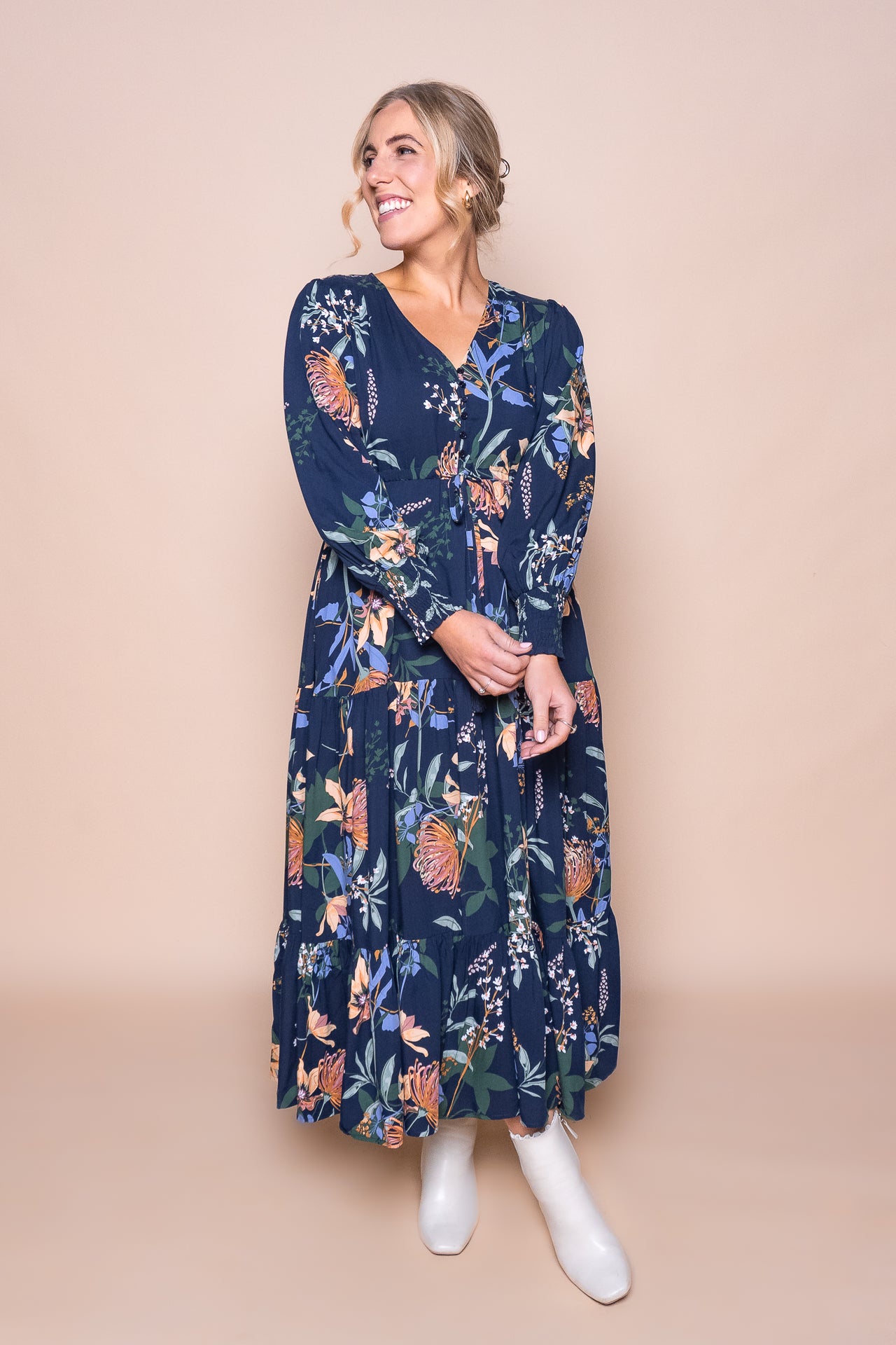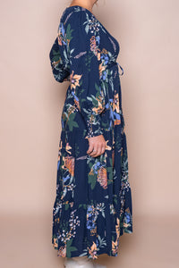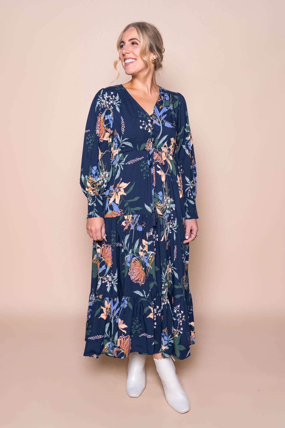 Introducing our Jacinda Dress in Navy, featuring a stunning floral print in navy, green, periwinkle, tan, and white. The v neckline and functional buttons add a touch of elegance, while the drawstring waist and tiered skirt provide a flattering silhouette. Functional side pockets and a front split detail make this maxi dress both stylish and practical. Crafted from 100% Rayon, this dress is true to size and perfect for any occasion.