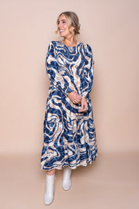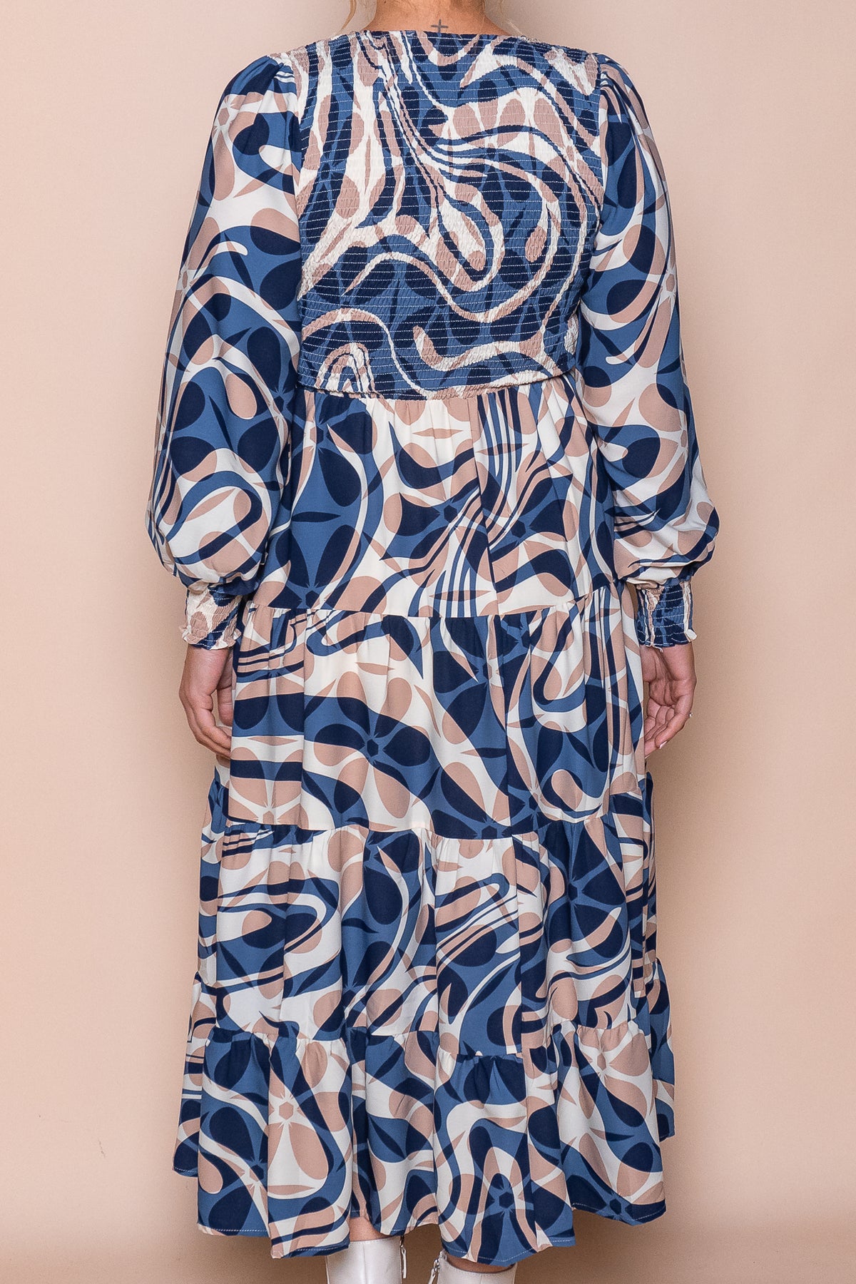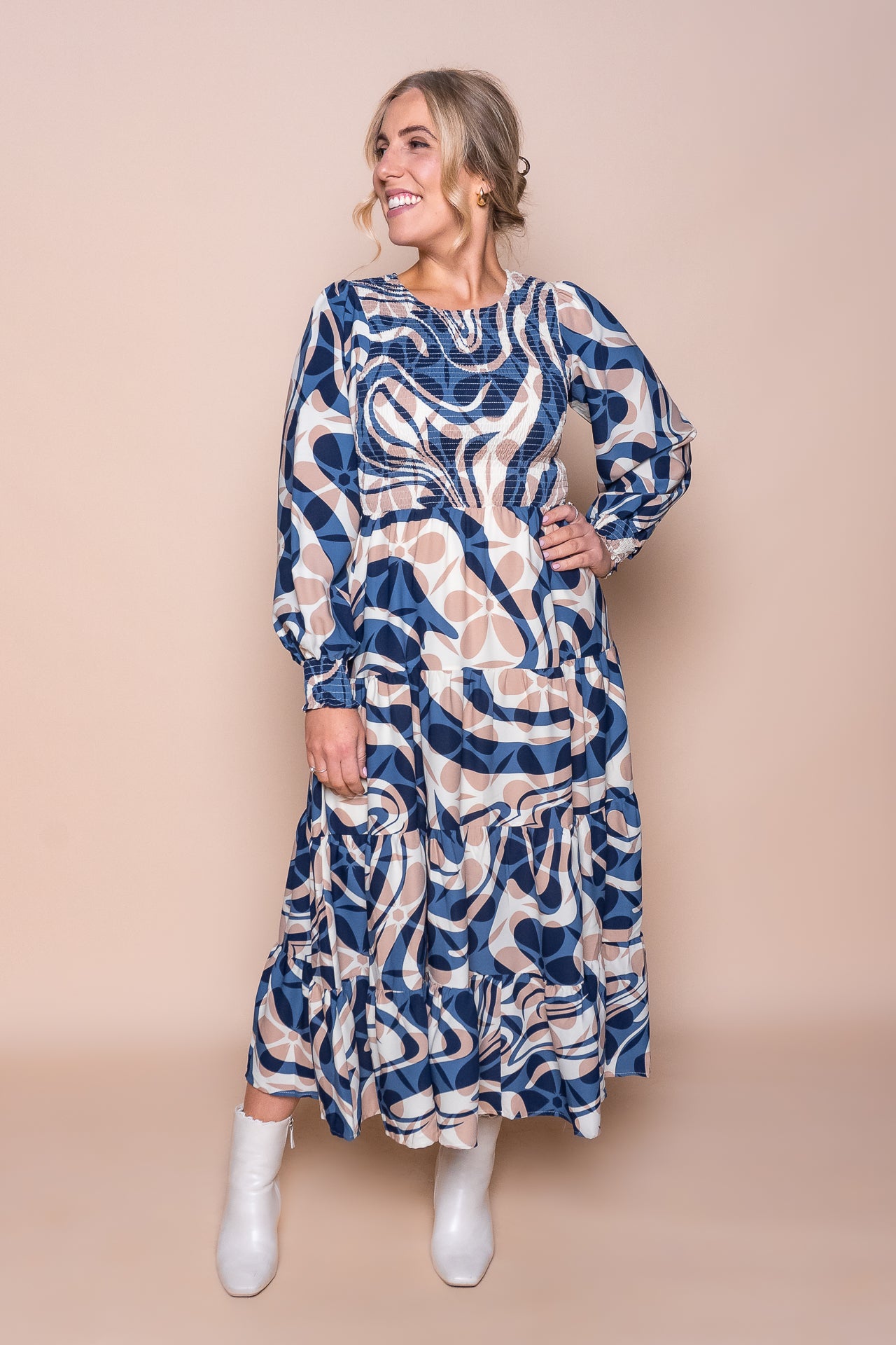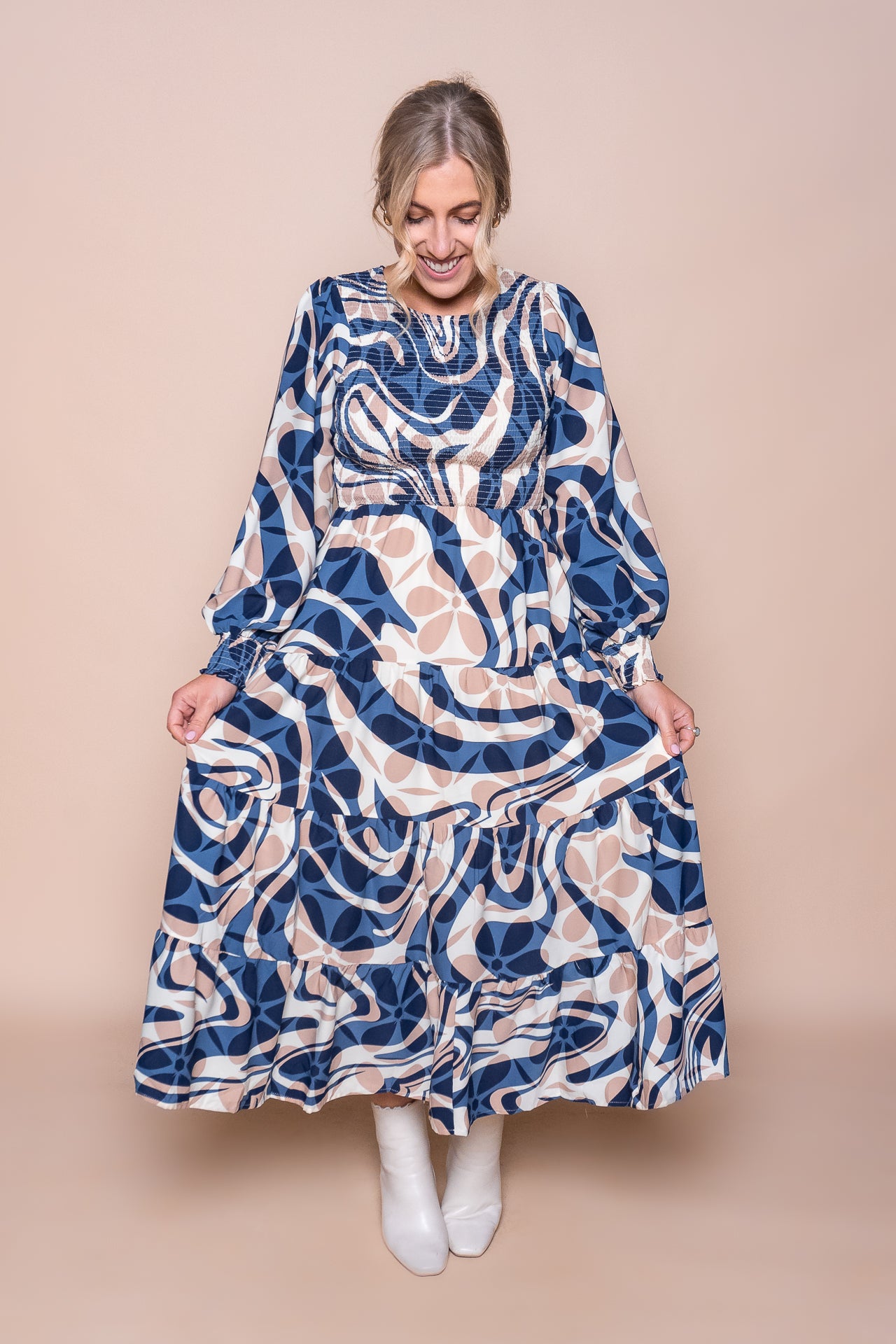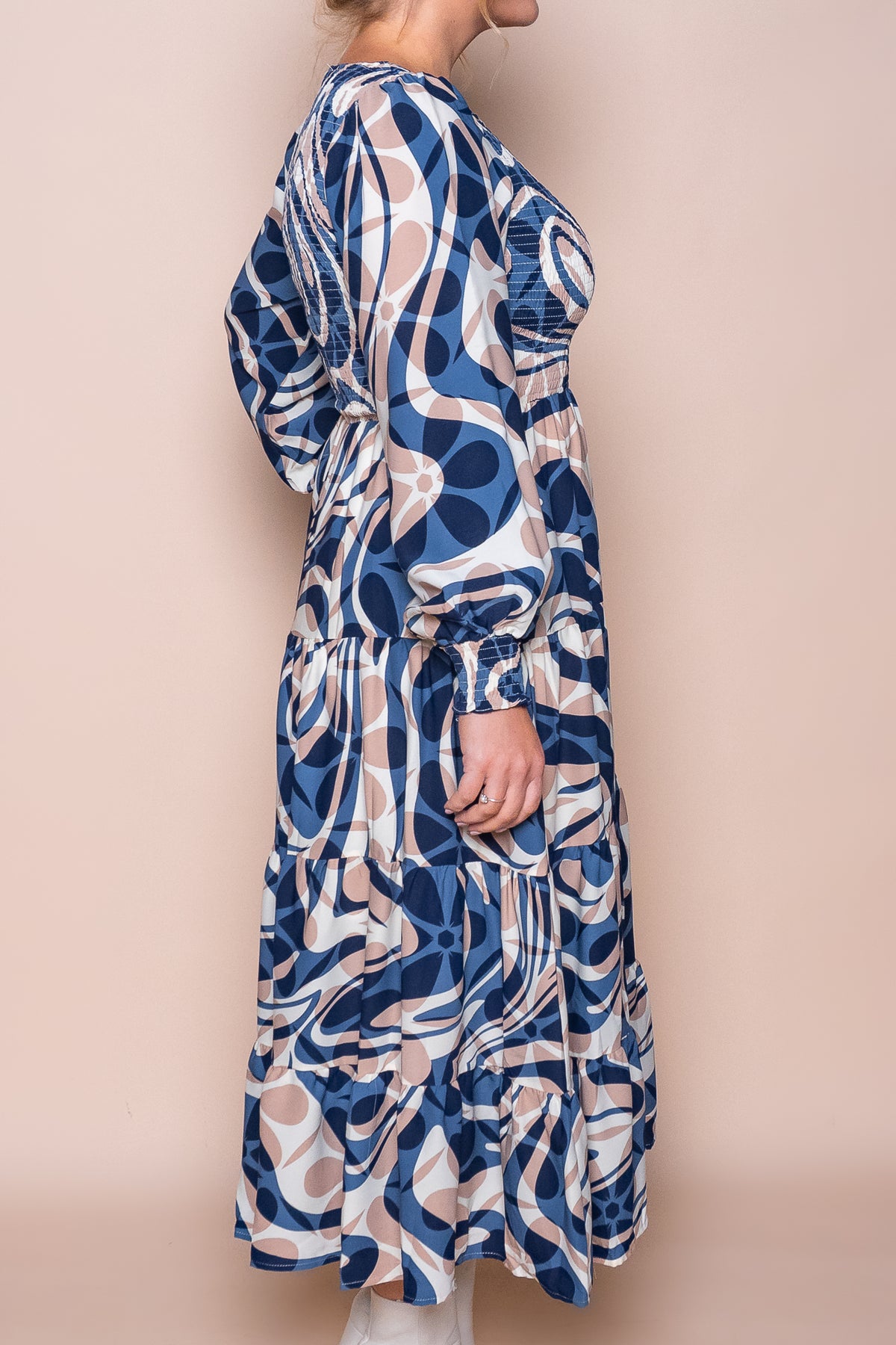 Inspired by abstract art, the Kadence Dress in Navy is a statement piece for the modern woman. The shirred bodice and elasticated cuffs provide a comfortable and flattering fit, while the tiered, midi-length skirt adds movement and drama. Made with a luxurious blend of cotton and polyester.