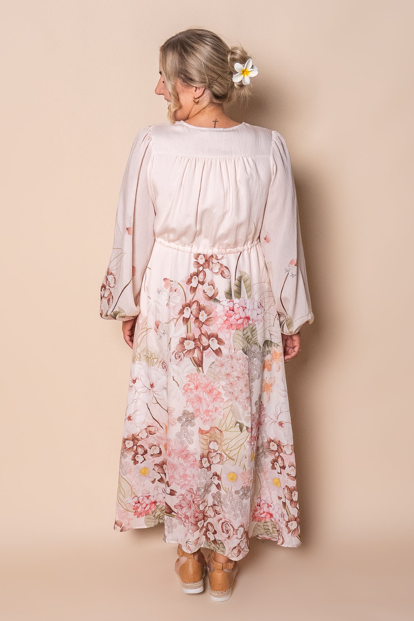 The Manuela Maxi Dress combines elegance with everyday practicality. Crafted from a luxurious viscose-blend fabric, this sophisticated piece features a striking floral border print in blush pink, chocolate, and green. The flattering V neckline and shirring detail at the front shoulders create refined structure, while functional gold-tone buttons at the bust add a polished touch. A drawstring waist allows for customizable fit, and full-length sleeves with elasticated cuffs provide versatile styling options. Functional side pockets and a front split detail enhance both comfort and movement. Fully lined and true to size, this maxi dress transitions seamlessly from day to evening.