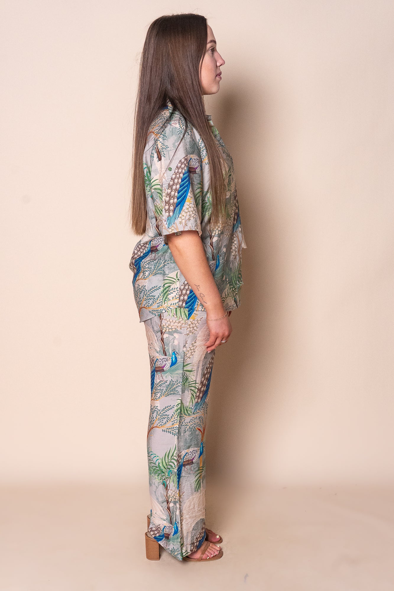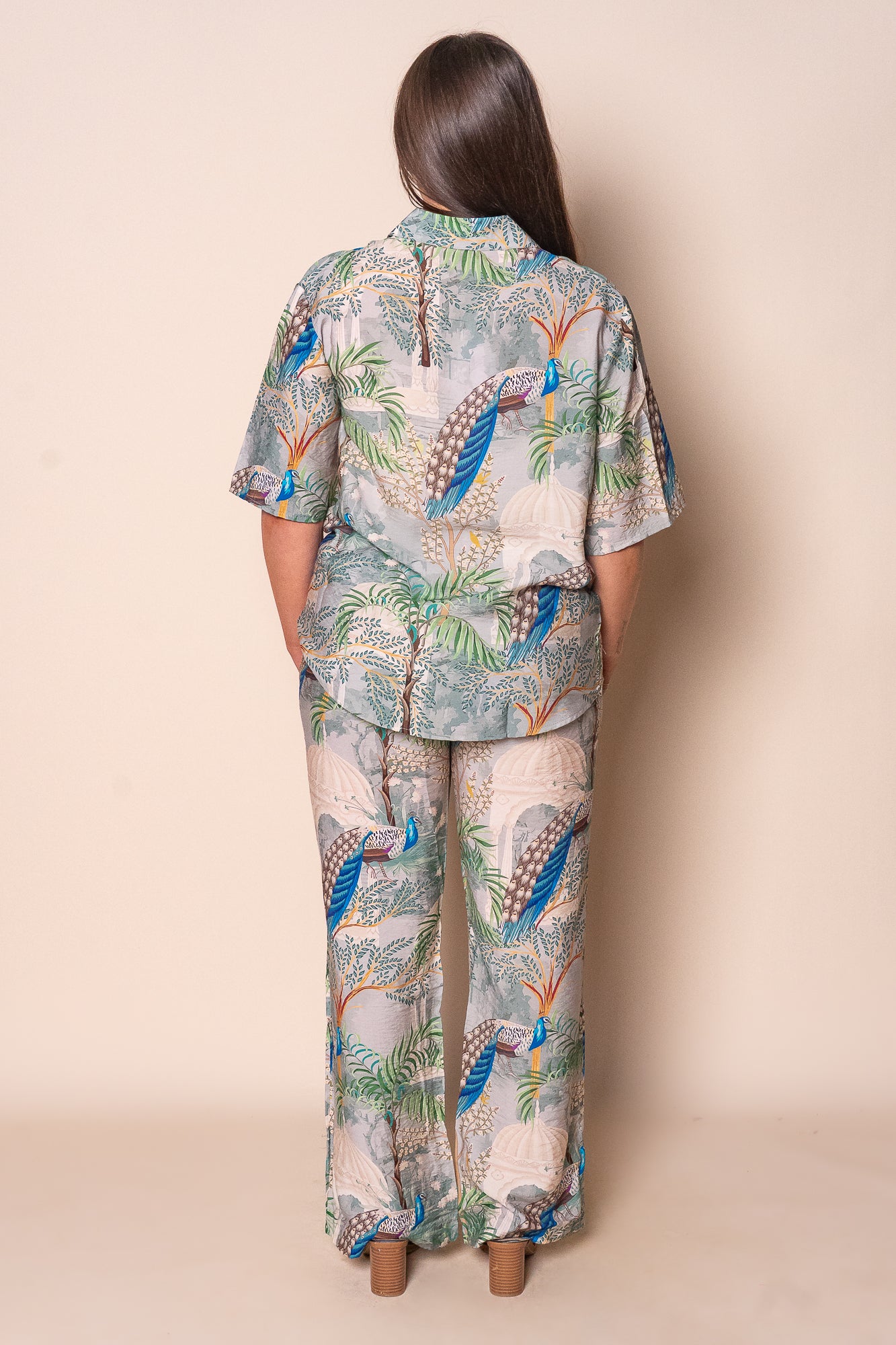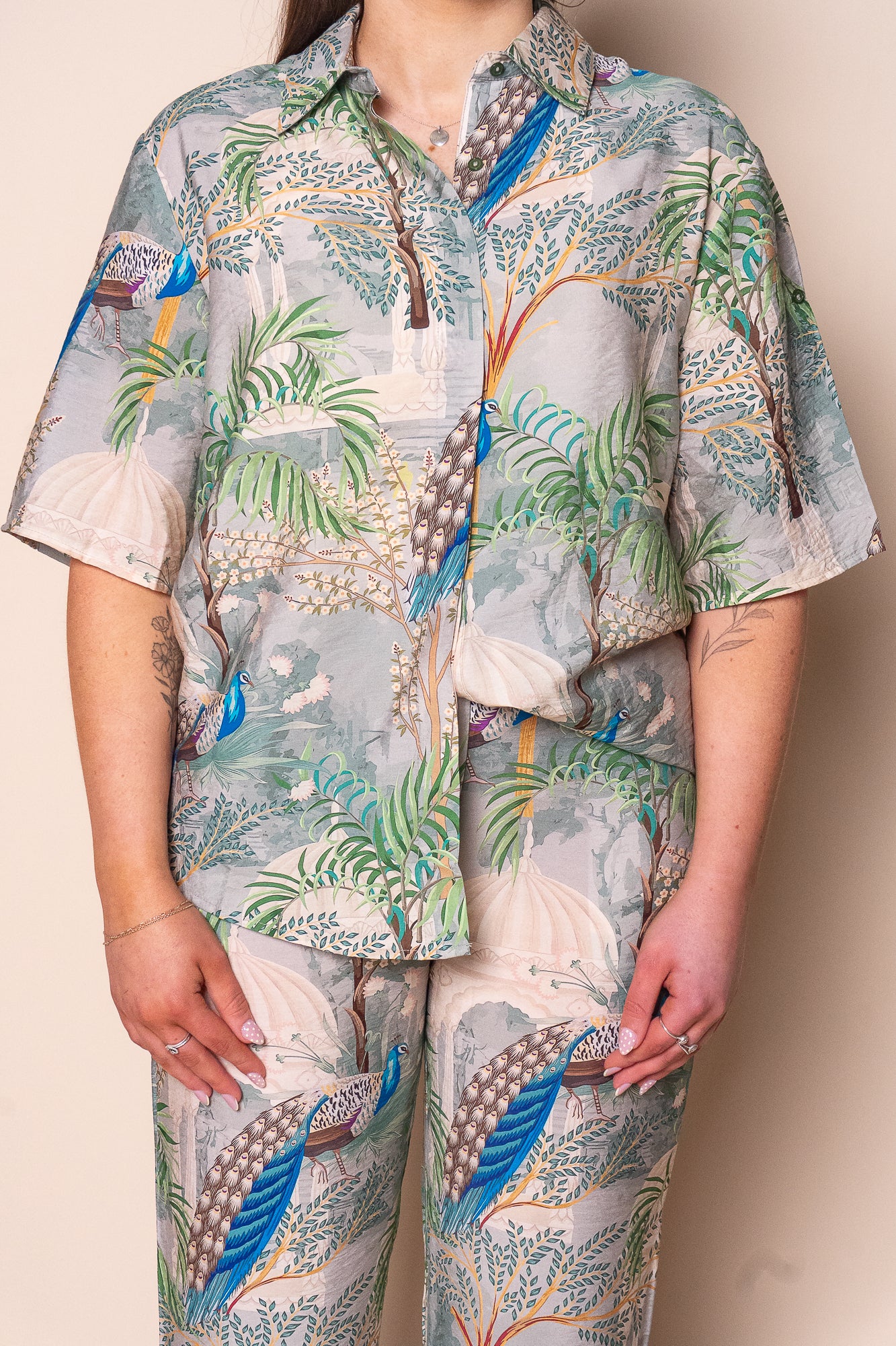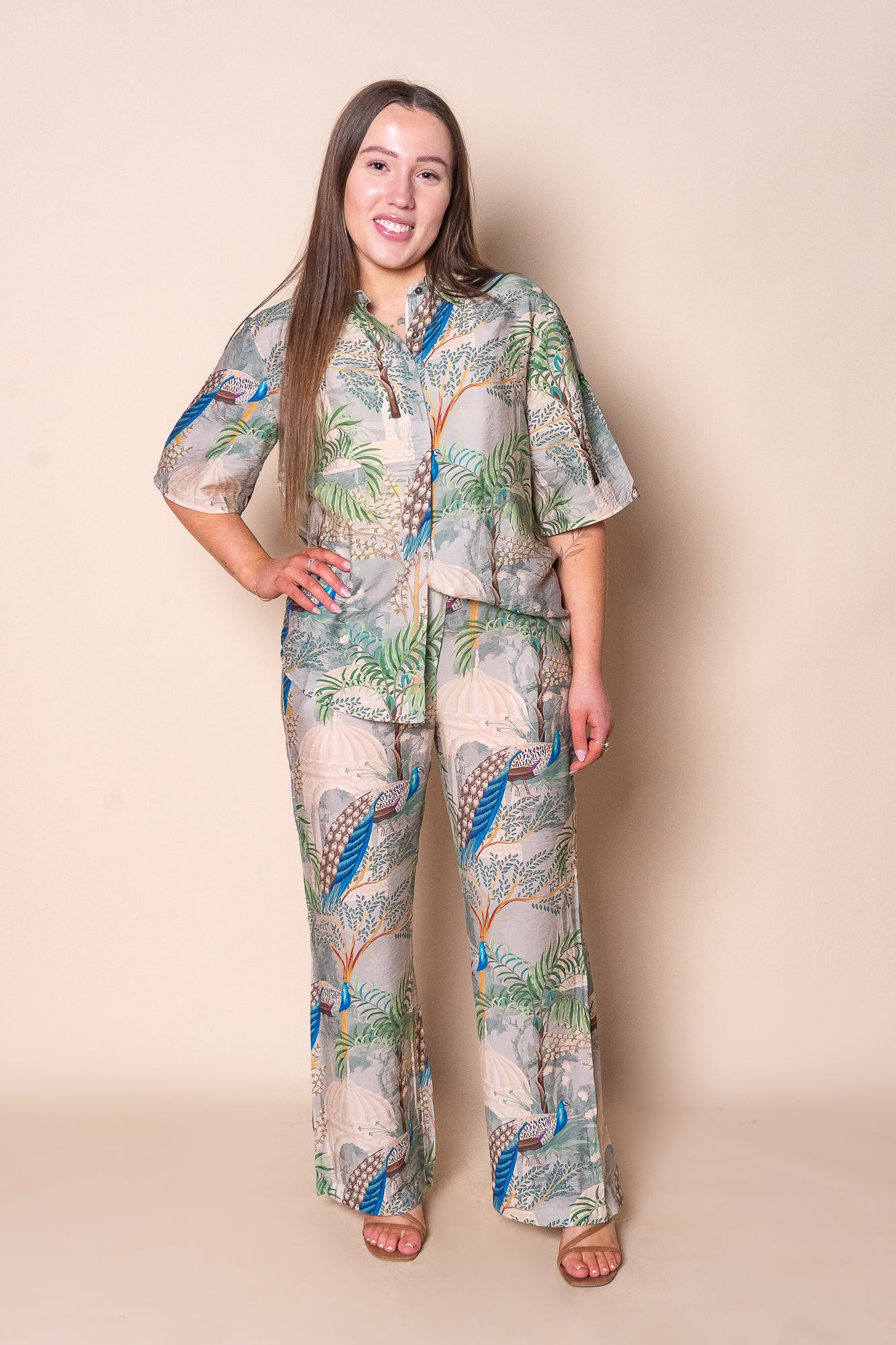Elevate your wardrobe with the Martha Set in Green, featuring an elegant 'Peacock in the Palace' print in soothing greens, blues, and beige. The tailored pants combine a front fly, button closure, fixed waistband with belt loops, and an elasticated back for a perfect fit, complemented by functional front pockets and a straight-leg silhouette. The matching collared top offers a refined button-down front, short rolled sleeves secured with buttons, and a curved hemline for graceful movement. Crafted from a soft viscose/polyester blend, this set is available in plus sizes and tailored true to size for timeless sophistication.