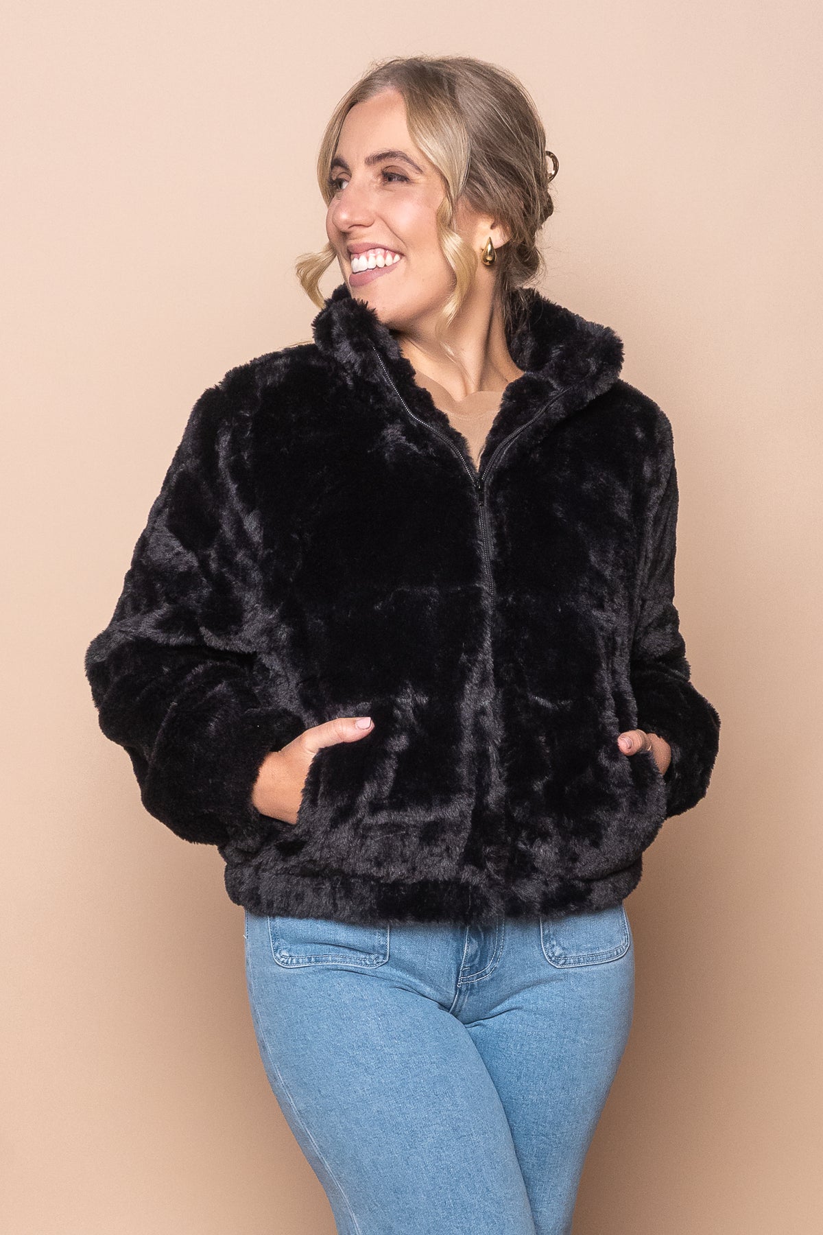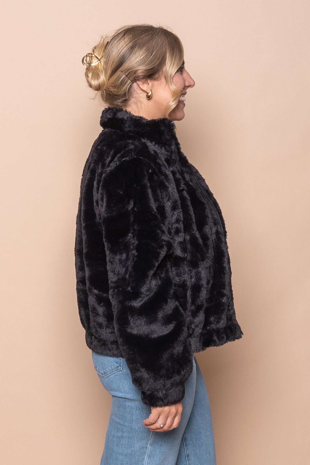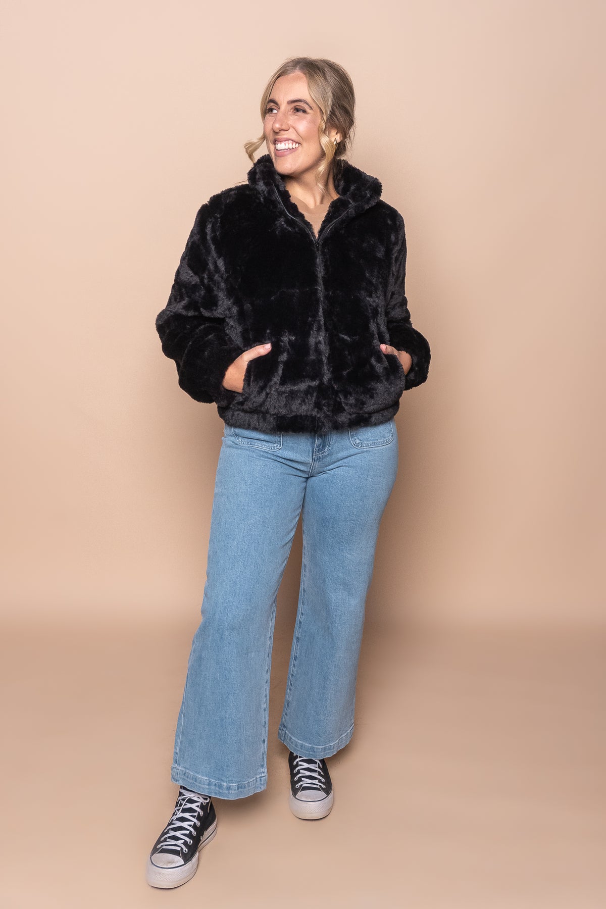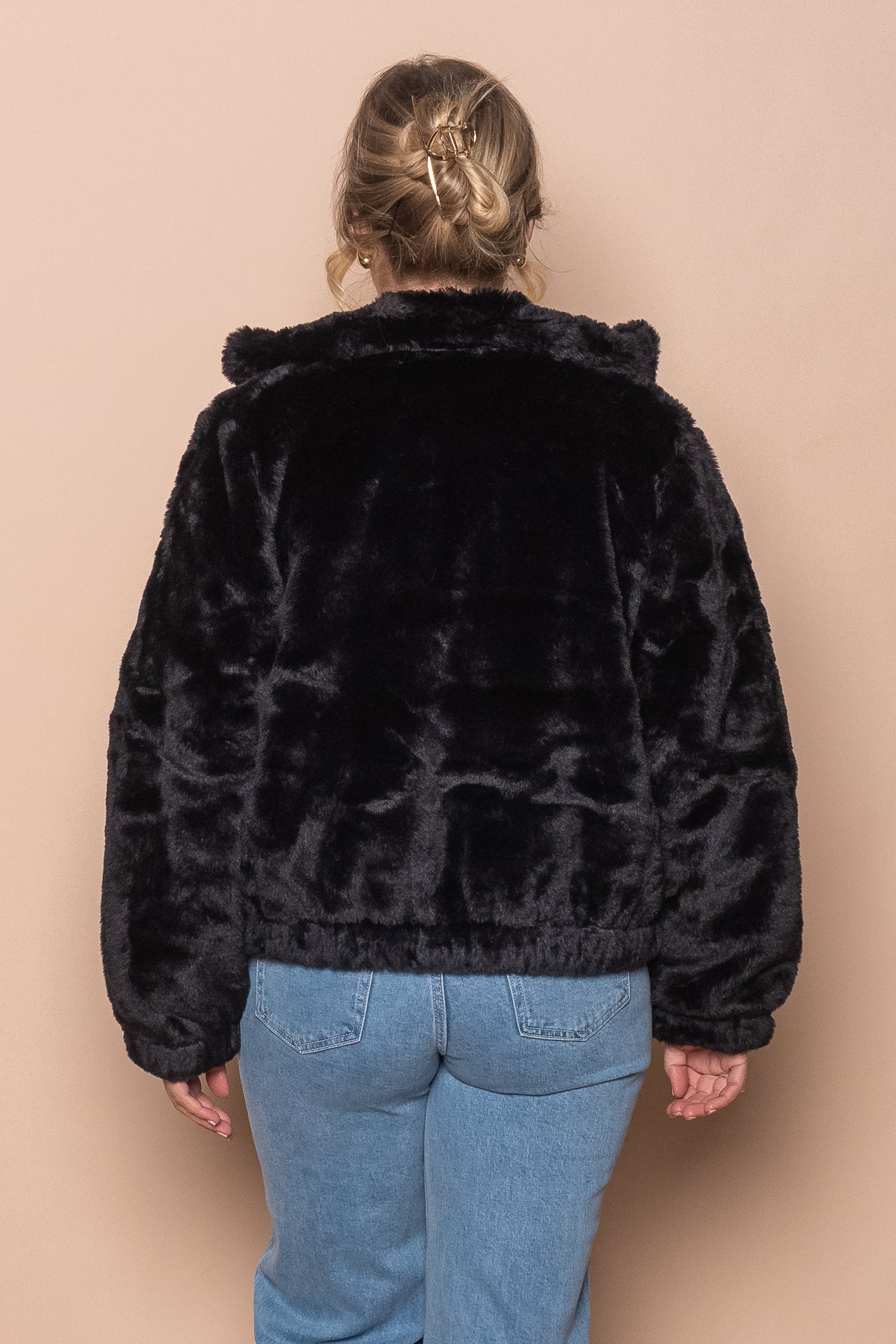 Stay warm and chic with our Mila Jacket in Black. Made with super soft faux fur and a high neckline, this jacket is perfect for those chilly days. Featuring a front zipper closure, functional hip pockets, and a fully lined interior, it combines style and functionality. Elevate your outfit with this fitted and true-to-size jacket.