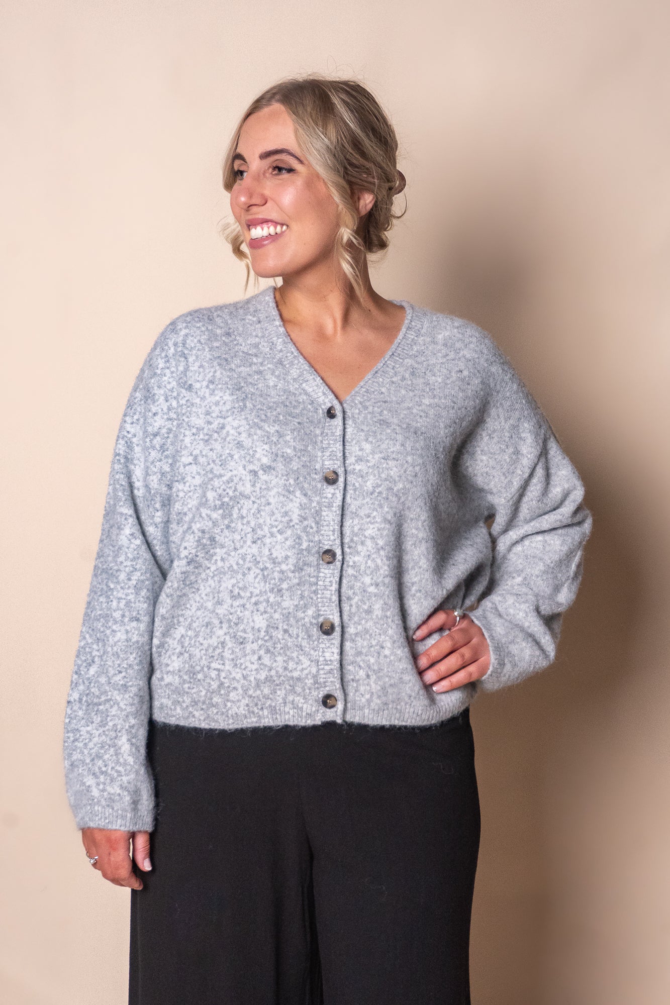 Meet your new go-to layer—the Nova Cardigan in Grey Marle is here to make getting dressed fun. Crafted from a sumptuous soft knit, this beauty features a chic V neckline, button-down front, and those dreamy drop shoulders that just work with everything. The relaxed, boxy fit skims your frame without clinging, while ribbed details at the neckline, cuffs, and hem keep things polished. Made with recycled polyester, wool, and a touch of elastane for stretch, it's as kind to the planet as it is to your wardrobe. True to size and endlessly versatile.