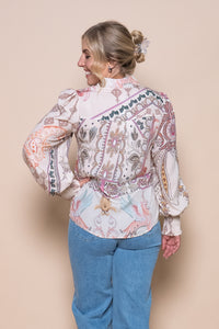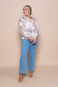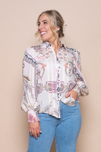 Introducing the Sherrie Shirt in Vintage Cream! This playful shirt features a unique floral art print and delicate lace detailing for a touch of whimsy. With long sleeves and a curved hemline, it's the perfect addition to your wardrobe. Get in quick!
