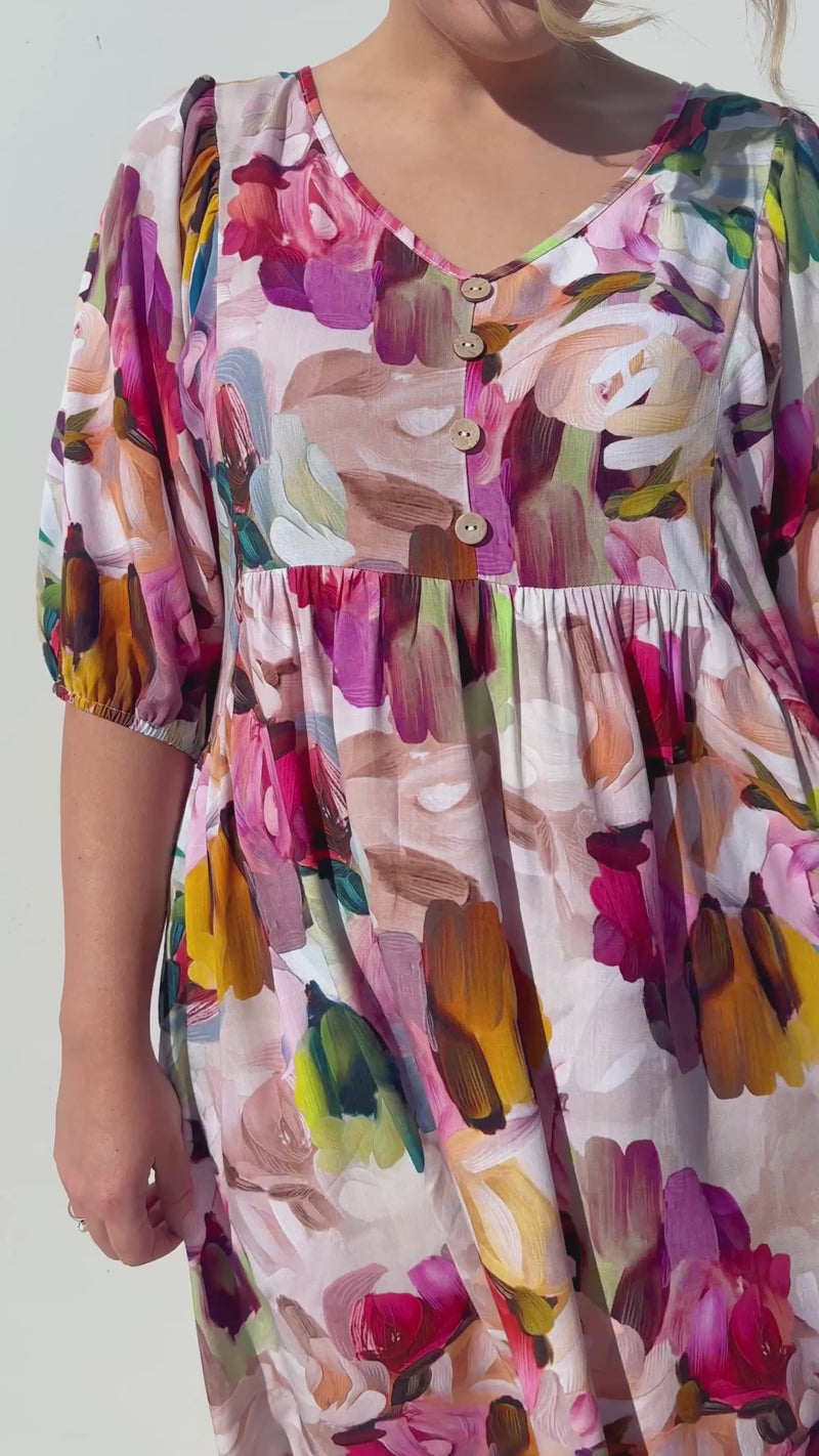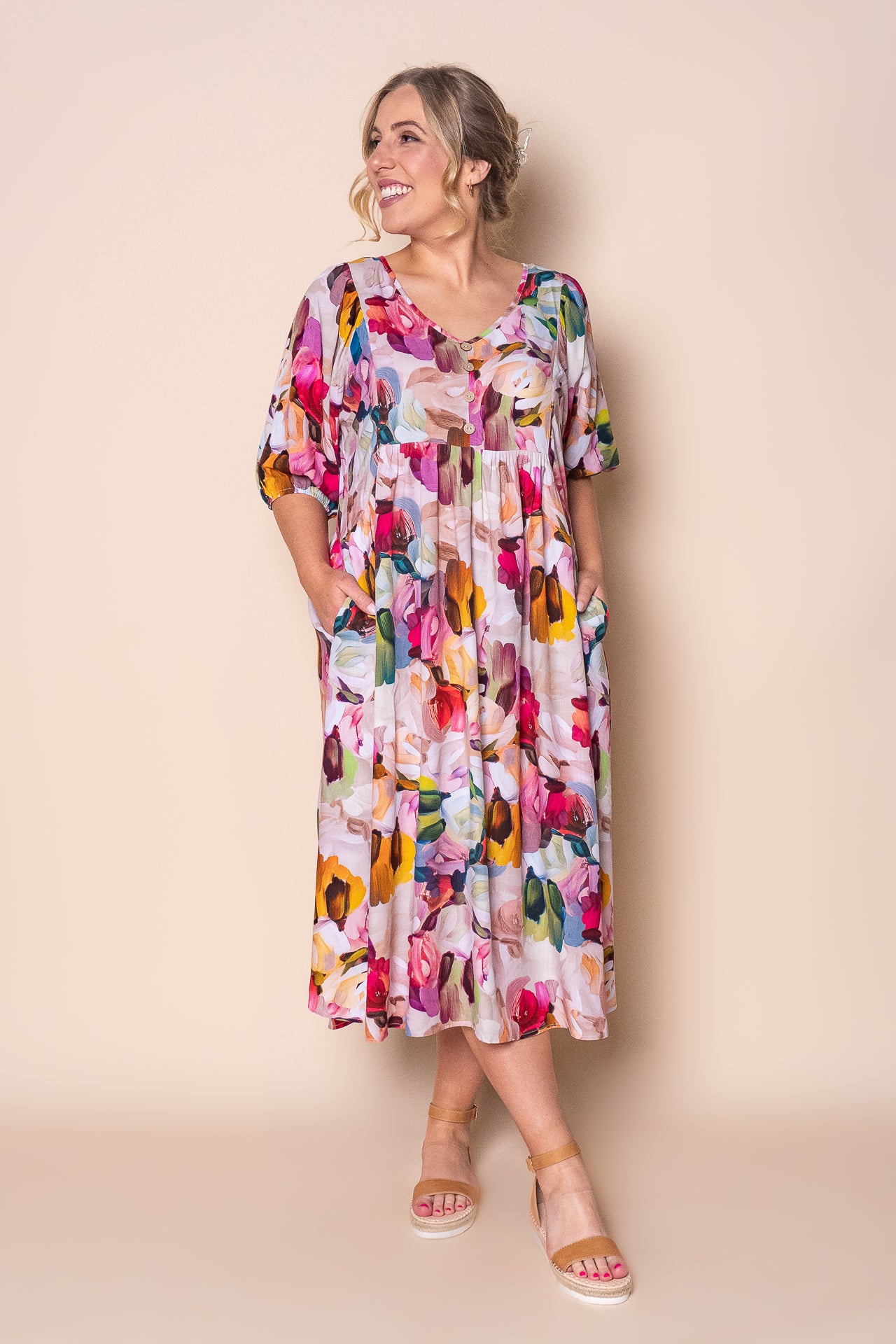 Embrace effortless style with the Simona Midi Dress in Pink Multi. Crafted from a breathable linen blend, this midi-length dress features functional pockets for convenience and a flattering faux button detail at the bust for added charm. Its vibrant multi-coloured pink pattern ensures you stand out, making it perfect for both casual outings and special occasions. Comfortable yet chic, this dress combines practicality with feminine elegance.