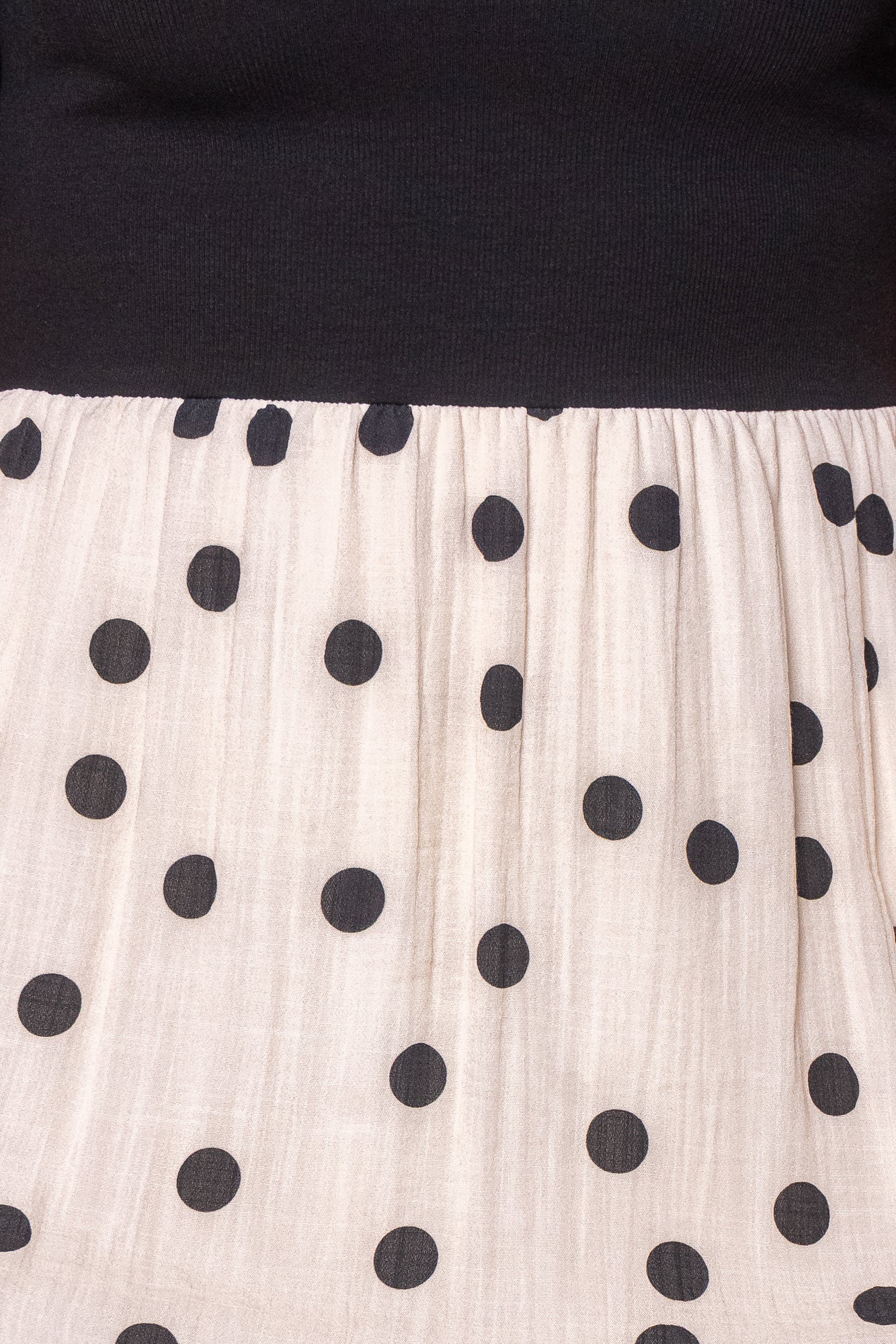 The Solenne Polka Dot Dress combines timeless elegance with everyday comfort. This sophisticated black and ivory design features a charming polka dot print, rounded neckline, and flattering 3/4 length sleeves with ribbed, stretchy fabric for a refined fit. The elasticated waistline and ribbed bodice provide gentle shaping, while functional side pockets add practicality. A lined knee-length skirt completes the look. Crafted from a breathable viscose, polyester and cotton blend, this dress is true to size and available in extended sizing.