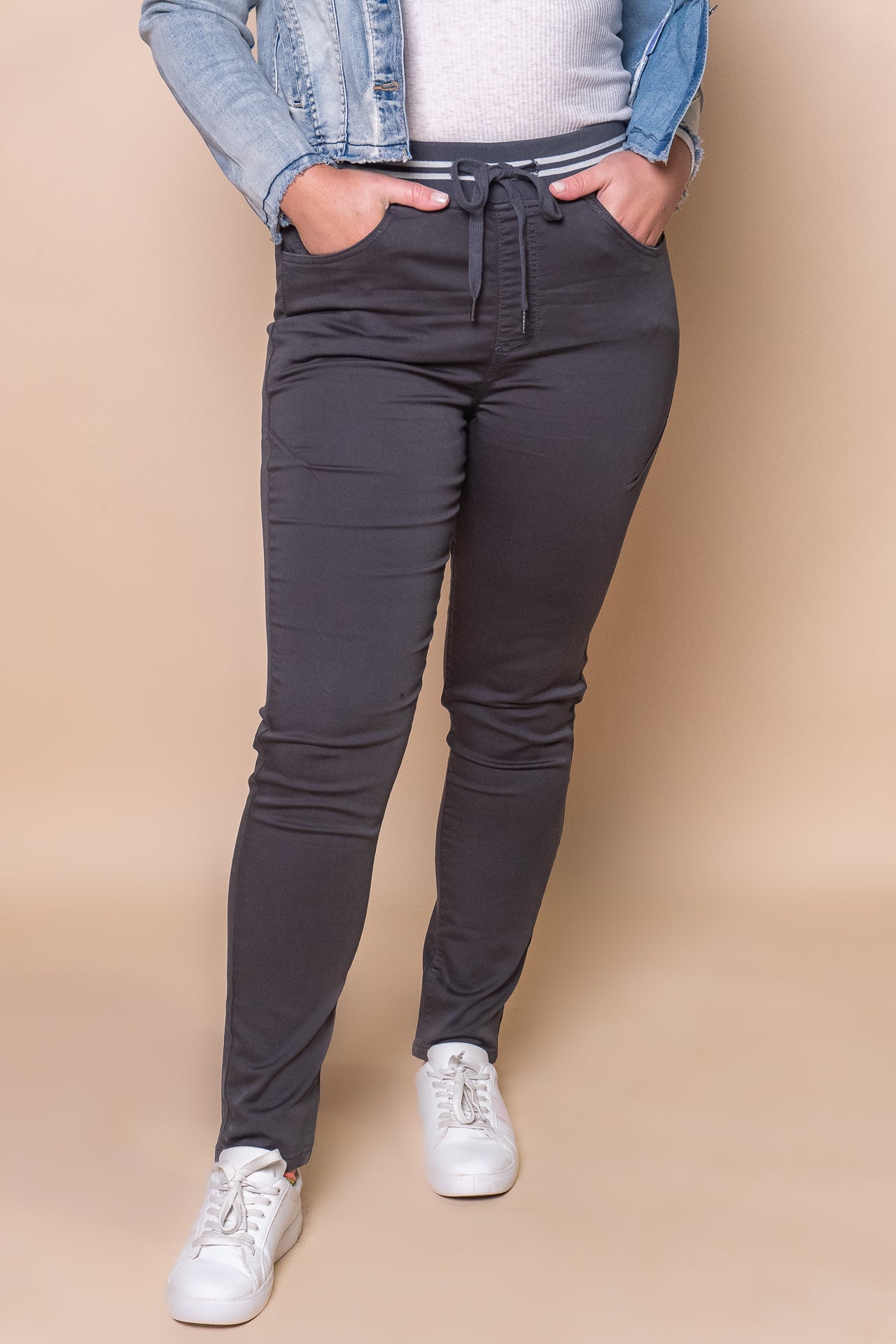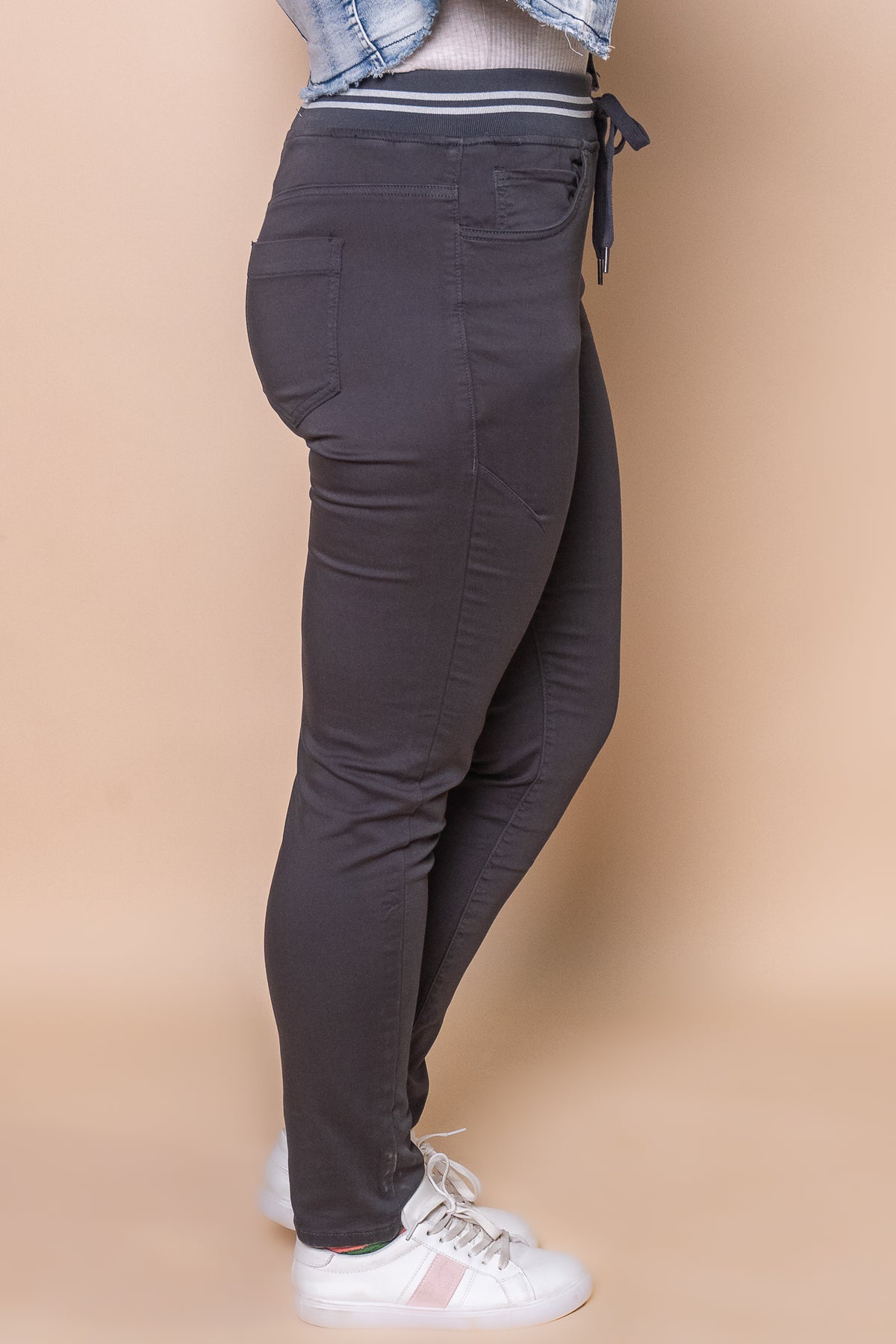Slip into comfort and style with Sylvia Joggers in Charcoal by Foxwood. These mid-rise jogger pants feature an elasticated waistband with ties and functional front and back pockets. The charcoal stitching adds a touch of flair to the soft, stretch fabric, while the true-to-size fit ensures a perfect fit. Made from a cotton blend featuring elastane for stretch, these joggers are perfect for everyday wear.