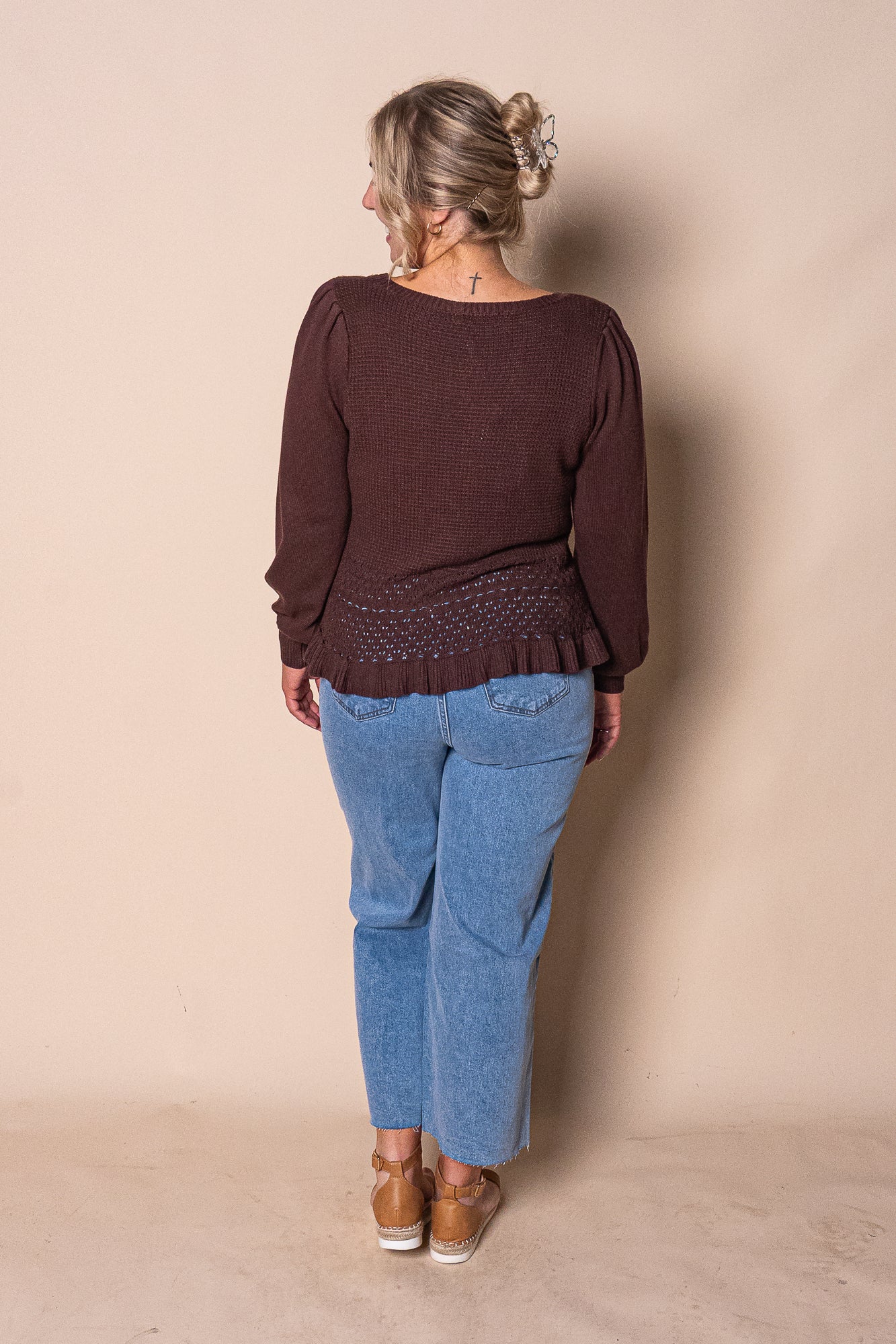 Wrap yourself in cosy comfort with the Vicki Knit Jumper in Chocolate. This everyday essential features soft cotton construction and long sleeves perfect for layering through the seasons. The straight hemline is finished with a charming ribbed ruffle detail that adds a playful touch to a timeless silhouette. Effortlessly versatile, it pairs beautifully with everything from jeans to skirts for a look that feels just right.