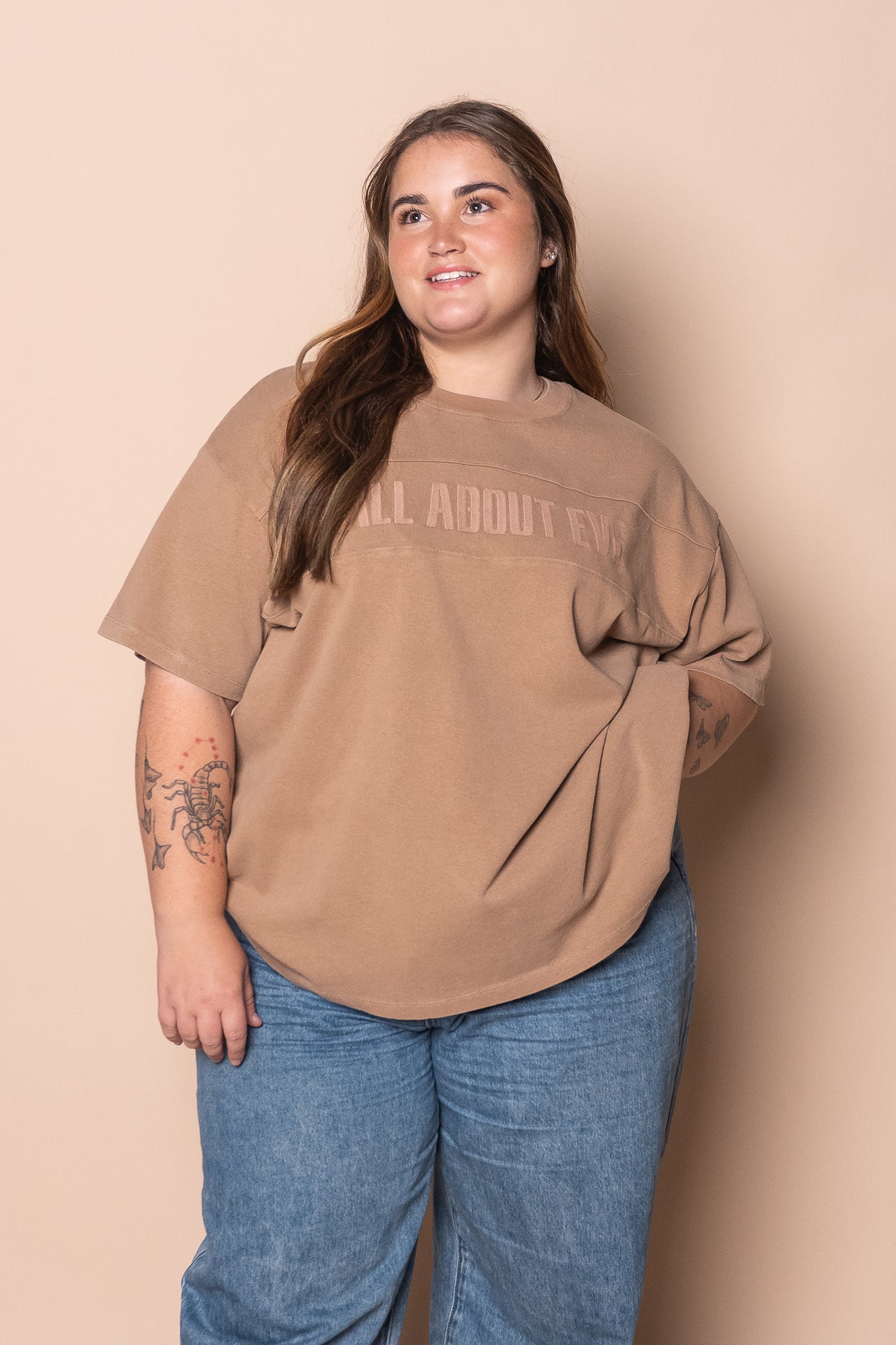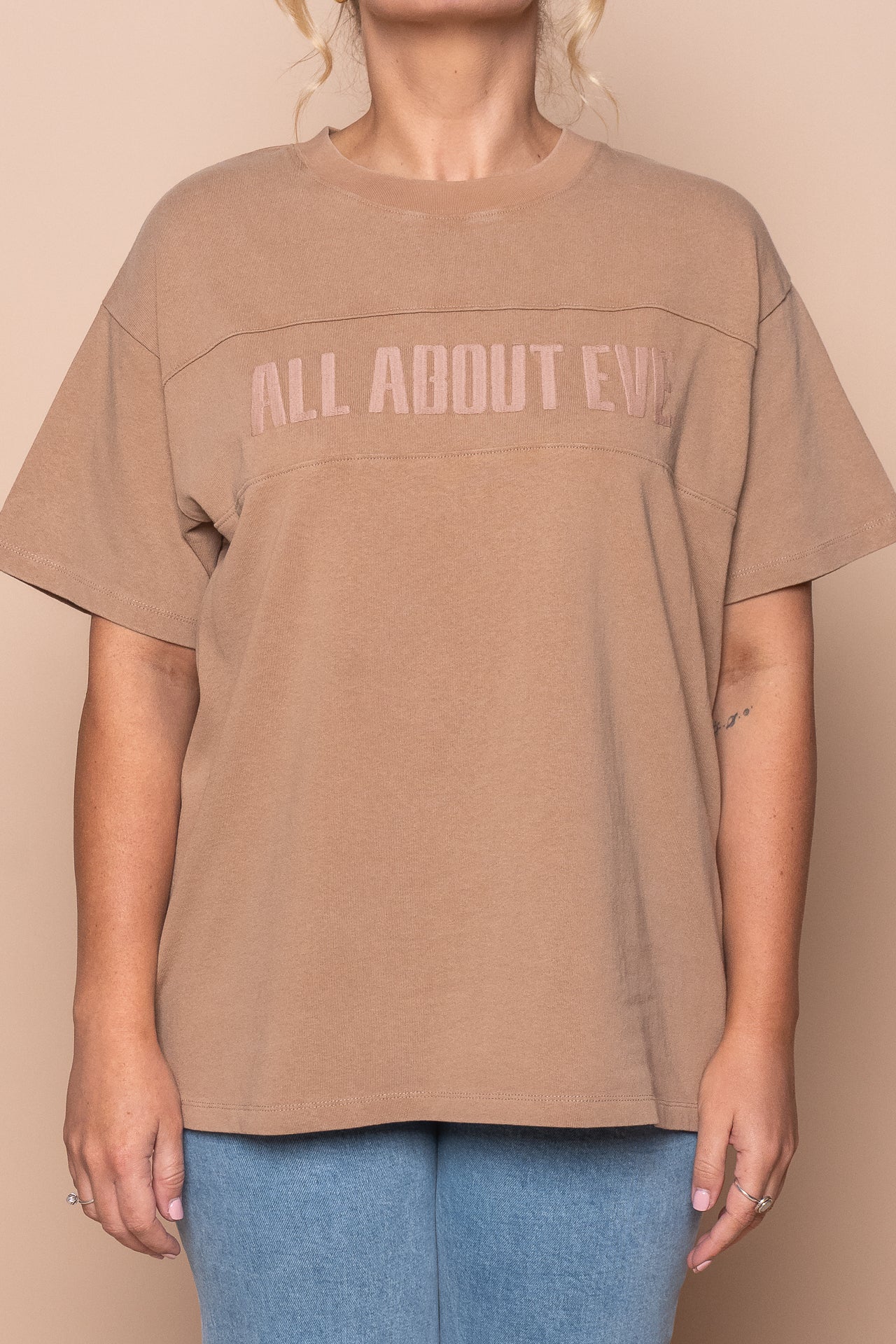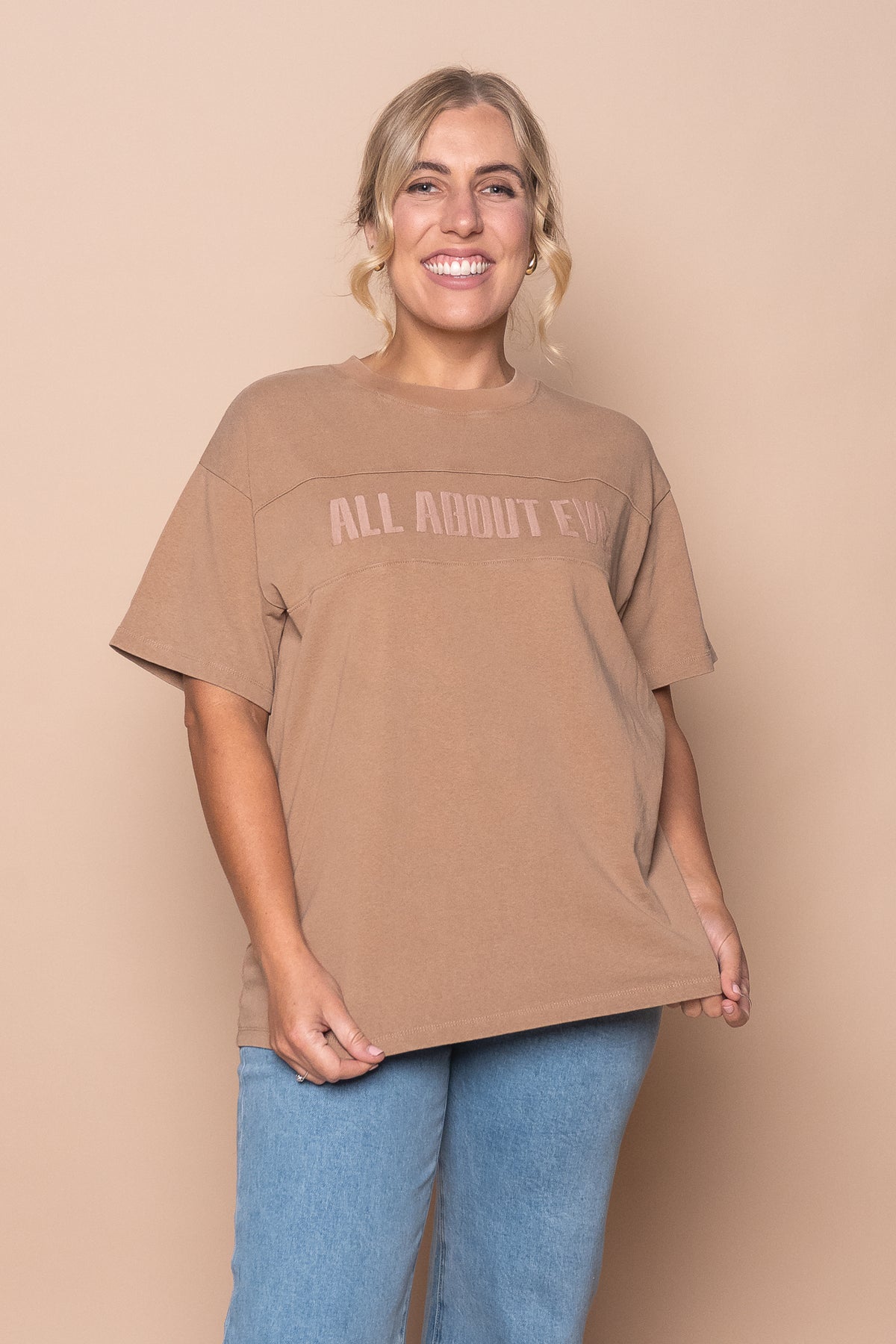 Introducing our Vital Washed Oversized Tee in Tan from All About Eve. Made from 100% cotton, this t-shirt boasts an oversized fit and round neckline for maximum comfort and style. Show off your love for All About Eve with the logo on the front. Perfect for a casual and laid-back look.