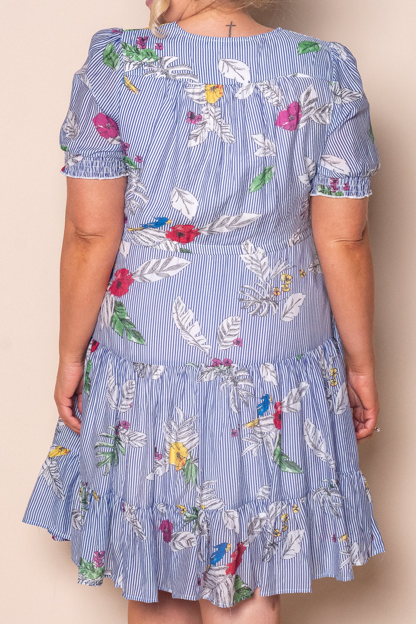 The Winsletta dress combines timeless elegance with everyday practicality. Crafted from a viscose and polyester blend, this knee-length style features a charming blue and white floral striped print that transitions beautifully through seasons. The flattering V neckline and tiered skirt create graceful movement, while functional buttons at the bust and side pockets add refined utility. An adjustable drawstring waist ensures a personalised fit, complemented by short sleeves with elasticated cuffs for polished comfort. Fully lined and true to size, this dress is available in extended sizing to suit all figures.